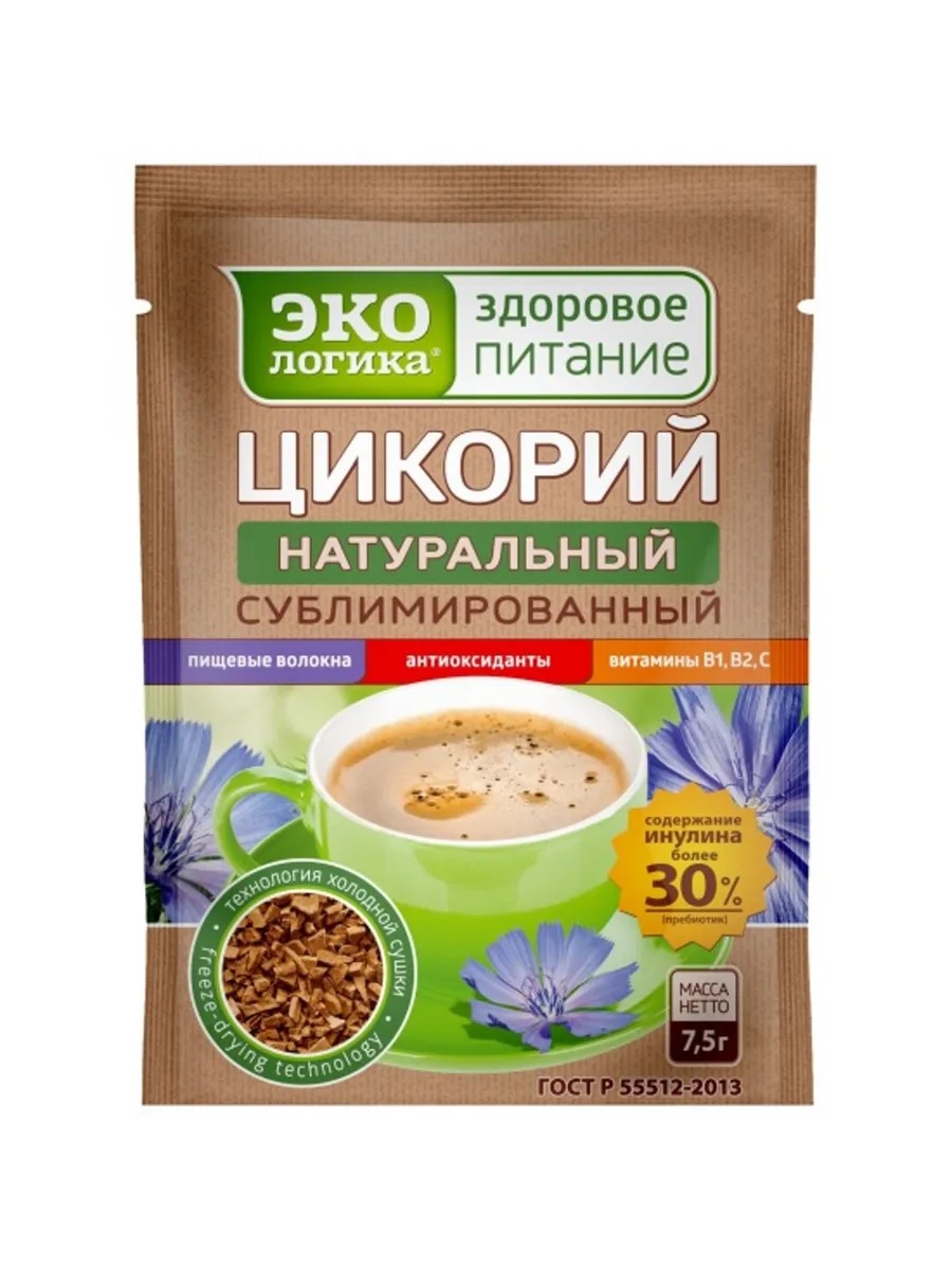 Экологика Цикорий растворимый, сублимированный, 75 гр, 1 шт. Инновационный продукт - сублимированный цикорий Экологика - здоровое питание! Уникальная технология бережной низкотемпературной обработки позволяет сохранить в напитке витамины, минеральные вещества и пищевые волокна. Содержит пребиотик инулин, интибин, витамины группы В, витамин С, каротин, антиоксиданты.