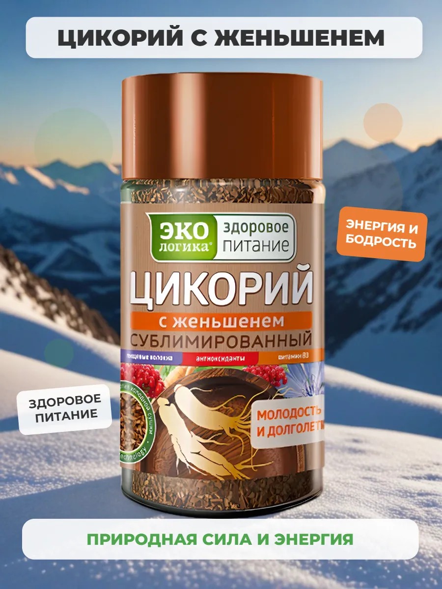 Цикорий Экологика натуральный сублимированный. Полезные вещества, содержащиеся в цикории, оказывают комплексное благоприятное воздействие на организм: повышают иммунитет, нормализуют уровень сахара, способствуют снижению веса, улучшают пищеварение, способствуют выведению холестерина, помогают работе сердца.Корень женьшеня - источник молодости и здоровья, обладает адаптогенным, общеукрепляющим и тонизирующим действием, улучшает работу нервной системы, повышает трудоспособность, замедляет процессы старения. Уникальная технология бережной низкотемпературной обработки позволяет сохранить в напитке витамины, минеральные вещества и пищевые волокна. Содержит пребиотик инулин и витамин В3 натурального происхождения.