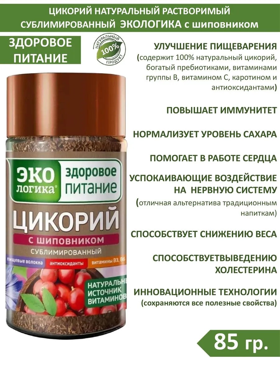A unique innovative product has appeared in Russia, which has no analogues in the world - freeze-dried chicory Ekologika - healthy nutrition! The chicory freeze-drying technology developed by Ekologika eliminates the impact of high temperatures during production. Therefore, the taste, aroma, all the vitamins, microelements and dietary fiber in freeze-dried chicory Ekologika - healthy nutrition are fully preserved. Useful properties of freeze-dried chicory: improves digestion; normalizes the pancreas; reduces the glycemic index; calms the nervous system; promotes better blood flow; helps heart function; helps remove cholesterol from the body; reduces harmful salt deposits in the body; dissolves and removes gallstones; helps get rid of insomnia; improves the function of the eye muscles; strengthens the immune system; has no contraindications. Ecologika Chicory with Rosehips, 85g, glass jar — a freeze-dried drink from the Ecologika collection, 85g, in a glass jar. Ecologika Chicory with Rosehips is a healthy drink containing natural rosehip extract. Rosehips reduce capillary fragility, help normalize lipid metabolism, improve liver function, and increase the body's resistance to harmful environmental influences. Storage conditions, °C: 0 to 25. Expiration date, months: 18. Preparation method: Prepare the instant drink at a rate of 1-3 teaspoons per 1 cup. Pour hot boiled water or milk and stir. Add sugar and cream to taste. It is advisable to use filtered water. Chicory has a beneficial effect on the entire body: it lowers blood glucose levels, improves pancreatic function, and improves cardiac activity. It is used as an antimicrobial and astringent agent. It can replace both sugar and starch. It is recommended for many gastrointestinal problems. It also has a general strengthening effect on the immune system. It promotes wound and eczema healing, and has a mild antitumor effect. The chicory freeze-drying technology developed by Ecologika eliminates exposure to high temperatures during production. Therefore, the taste, aroma, vitamins, microelements, and dietary fiber in the freeze-dried chicory "Ecologika - Healthy Nutrition" are fully preserved. Ecologika Chicory with Rosehips, 85g, Glass Jar, belongs to the well-known brand: The pride of the "Ecologika" brand is the high-quality materials and professional technologies used on the company's production equipment. Ecologika Chicory with Rosehips, 85g, Glass Jar, is packaged in environmentally friendly packaging that ensures proper storage and a beautiful, modern appearance. Made from high-quality raw materials according to all specifications and GOST standards, it is brand-certified with all technical specifications and sanitary and epidemiological regulations. The manufacturer guarantees the product's freshness and aroma throughout its entire shelf life. Storage conditions: Store Ecologika Chicory with Rosehips 85g.
