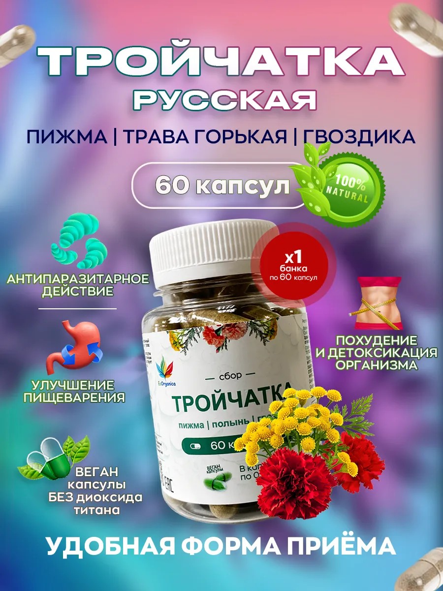 Dosage: 500 mg per capsule. Troichatka, a remedy for parasites and worms, is among the most effective. This antiparasitic complex for humans, the herbal collection "Troichatka" in capsules (finely ground for better bioavailability), promotes cleansing from parasites (human worms, helminths, and worm eggs), improves digestion and liver function, improves skin condition, and reduces sugar cravings, which has a beneficial effect on weight loss. And, equally important, it is also safe, meaning it cannot harm a single cell of the human body. It contains three herbal powders, taken in strictly defined proportions. It includes tansy (namely its flowers), wormwood (the above-ground part of the plant), and cloves (seeds). Everything in nature is designed so that a person, living in harmony with it, can always find something to eat and how to heal. To stay healthy, you need to keep your body clean not only on the outside but also on the inside. Chemical medications offer only limited relief, often damaging the health of internal organs, especially the liver. Troichatka is perhaps the most effective antiparasitic remedy. Directions: A full course of treatment lasts 21 days. Take 1 capsule twice daily. Recommended for transitioning to a healthy diet (including veganism and raw foodism), during cleansing (detox and weight loss), for helminthiasis prevention, and when symptoms of worms are detected. Parasites cause numerous health problems that shorten life by several years.