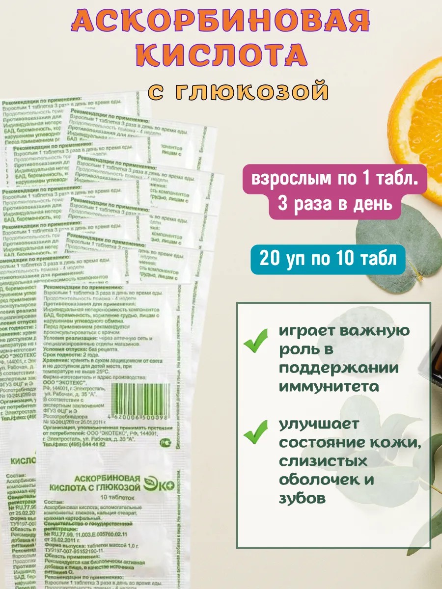 Аскорбиновая кислота с глюкозой ЭКО – это биологически активная добавка (БАД) к пище, представленная в виде таблеток массой 1 грамм, упакованных в стрипы по 10 штук. Это эффективный и доступный способ получить дневную норму витамина С, который играет важную роль в поддержании иммунитета, улучшении состояния кожи, слизистых оболочек и зубов, улучшении усвоения железа и других важных питательных веществ, а также в борьбе с окислительным стрессом. Глюкоза, входящая в состав таблеток, обеспечивает энергию для организма, а также улучшает усвоение витамина С.