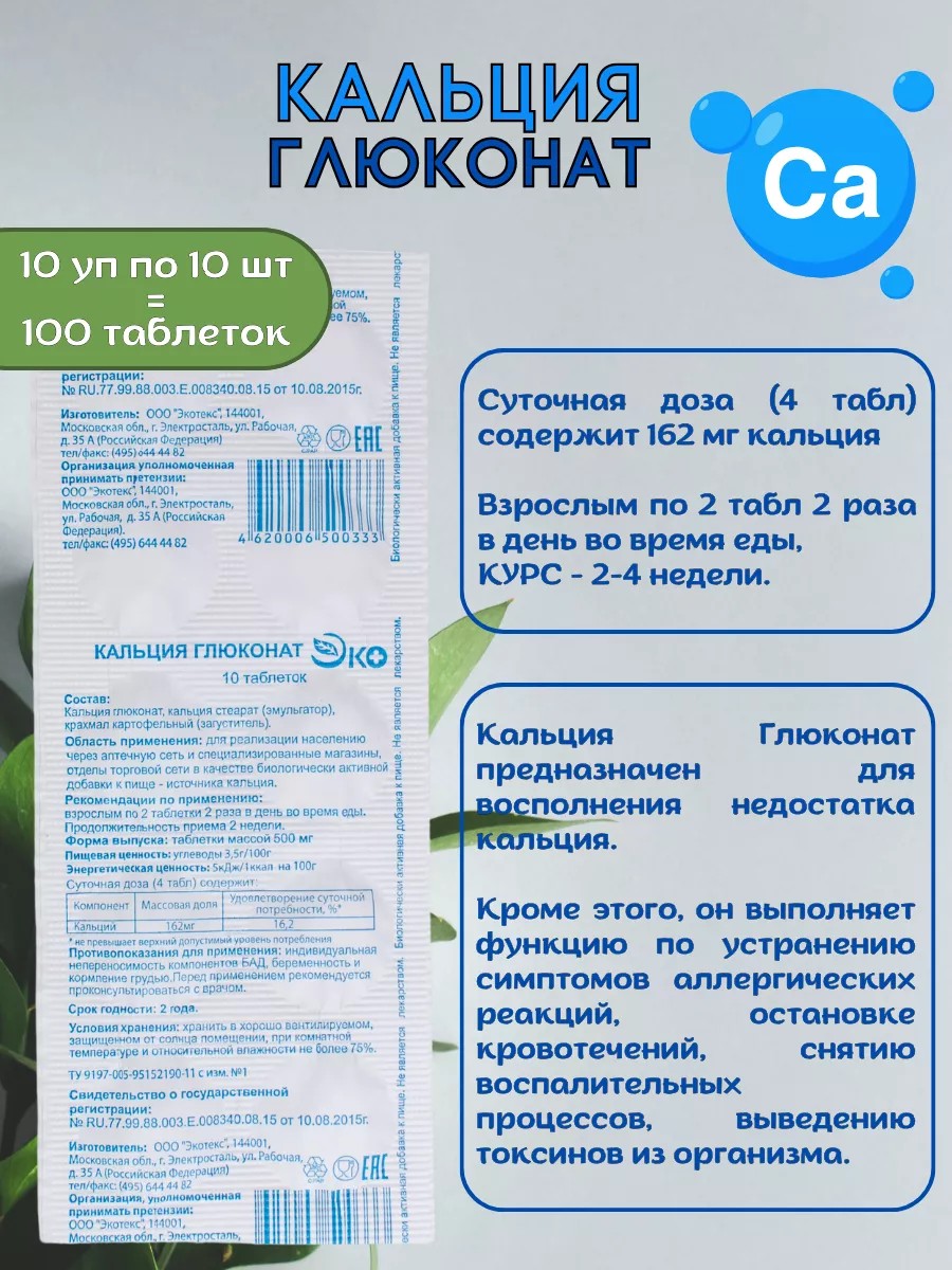 | Комплектация | Кальция глюконат 500 мг; 10 упаковок по 10 таблеток |