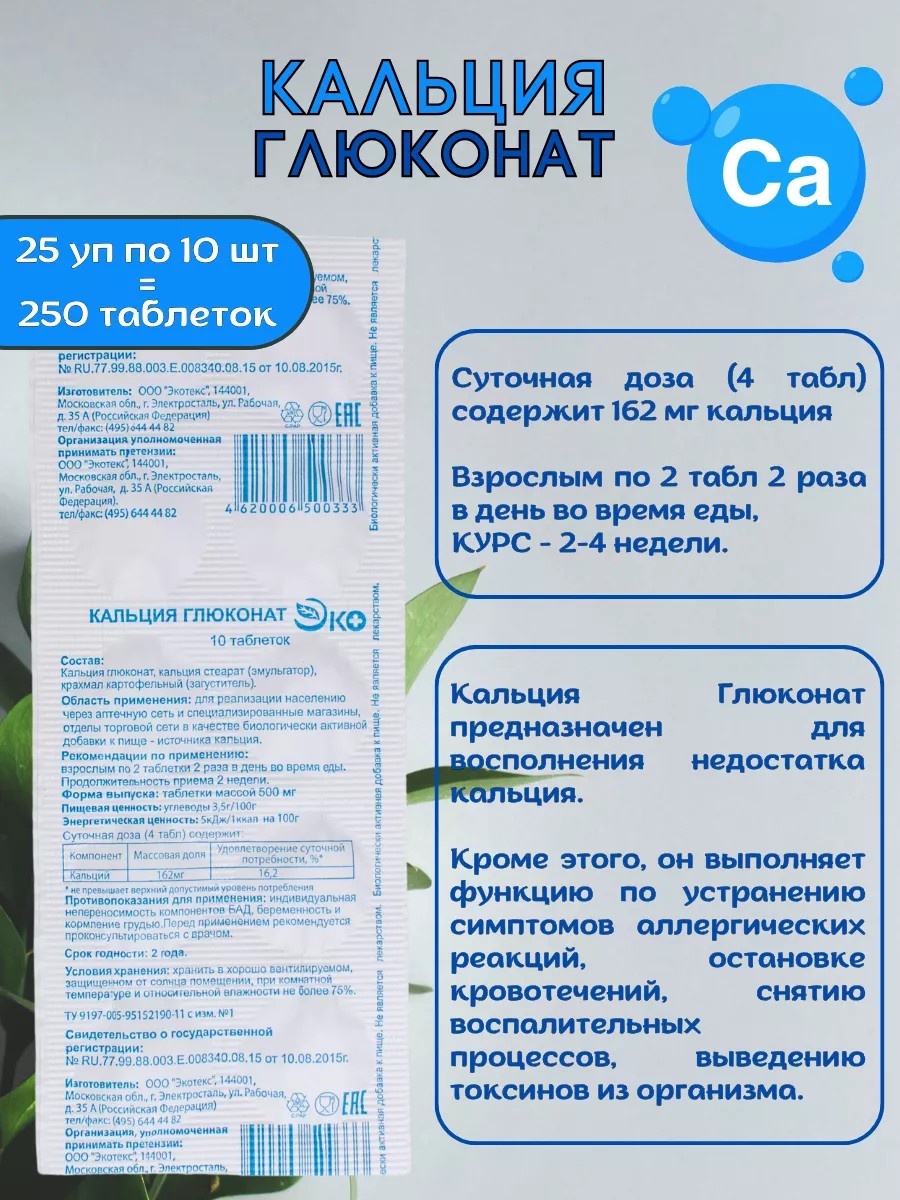 | Комплектация | Кальций глюконат таблетки; 25 упаковок по 10 таблеток |