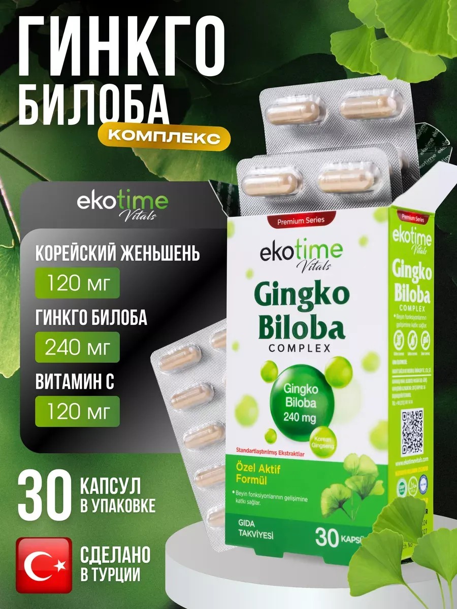 Бады Gingko Biloba complex, произведенные в Турции брендом EkoTime, созданы для поддержания крепкого здоровья. Пищевая добавка содержит набор натуральных и растительных компонентов, благотворно влияющих на организм. Гинкго билоба - известное растение, а также мощный и полезный антиоксидант. Способствует улучшению кровообращения и повышению мозговой активности. Экстракт листьев помогает справляться с вредными свободными радикалами, снижает риск различных заболеваний, связанных с сердцем и сосудами, замедляет процесс старения. Предназначен для симптоматического лечения когнитивных нарушений головного мозга у взрослых людей, включая ухудшение памяти, снижение концентрации внимания и интеллектуальных способностей. Корейский женьшень увеличивает выносливость и устраняет последствия стрессов. Восстанавливает силы и энергию. Витамин С укрепляет иммунитет, участвует в синтезе коллагена и улучшает усвоение железа. Положительно влияет на состояние кожи и волос на голове. Благодаря уникальной формуле, турецкий бад оказывает комплексное действие. Нормализует уровень холестерина в крови, борется с шумом в ушах и повышает тонус вен. Не является лекарственным средством. Мужчинам, женщинам и пожилым рекомендуется принимать по 1 капсуле в день в качестве дополнения к обычному питанию. Беременным девушкам, кормящим мамам и подросткам необходимо обязательно проконсультироваться с врачом, перед началом приема таблеток. Начните заботиться о своем самочувствие. Заказывайте бады Экотайм прямо сейчас!