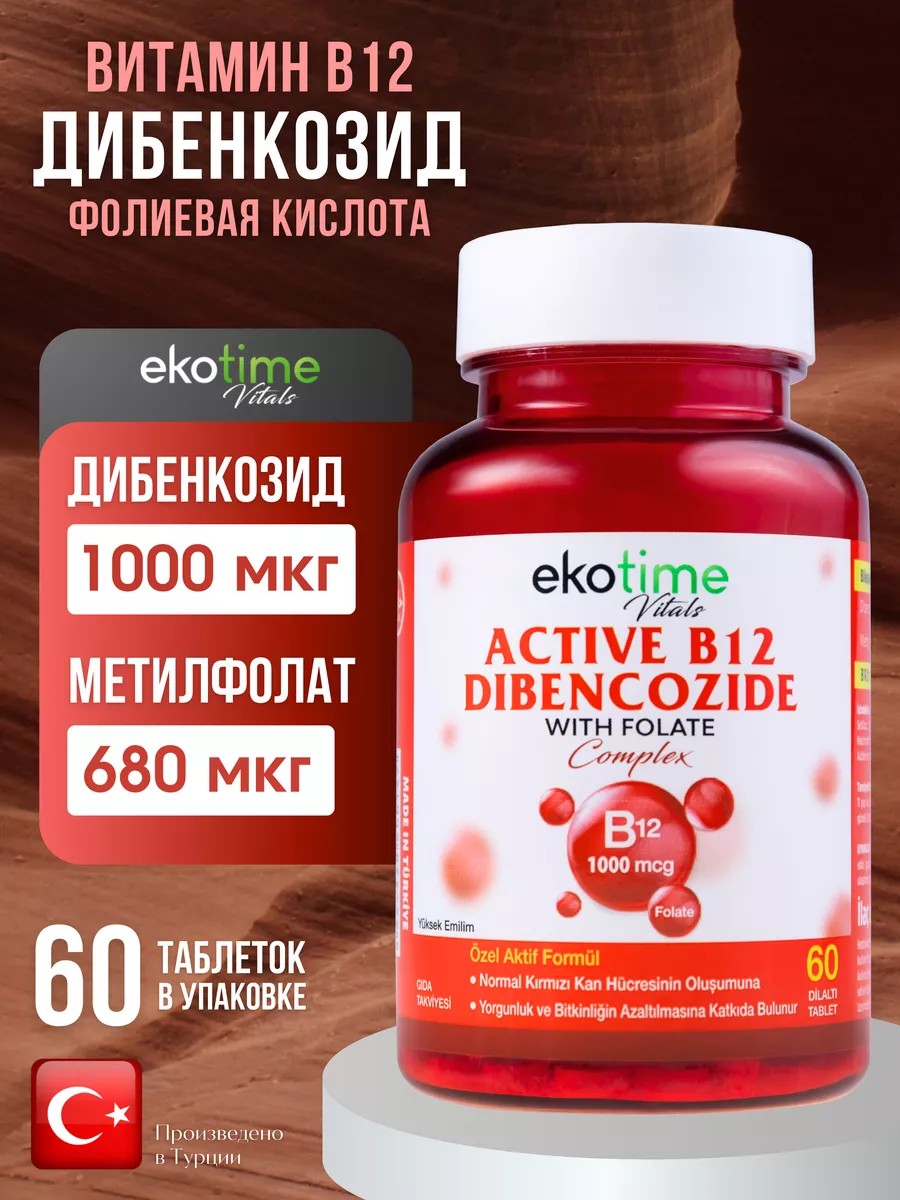 Active B12 Dibencozide from the Turkish brand EkoTime is a unique dietary supplement designed to support the health of the nervous system, blood, and overall well-being. Vitamin B12 (1000 mcg) is essential for the formation of red blood cells and DNA, protects the heart and blood vessels, ensures normal nerve function, and promotes sleep. This supplement contains the metabolically active form, dibencozide. It is better absorbed, ensuring the maximum effectiveness of this comprehensive dietary supplement. Methylfolate (vitamin B9) is necessary for amino acid synthesis and metabolism. It plays a key role in the proper development of the fetus during pregnancy. Folic acid helps improve memory, attention, and cognitive function. This vitamin complex reduces fatigue and tiredness, normalizes immune function, helps combat insomnia, and cope with anxiety. This product is beneficial for adult women, men, and the elderly. Pregnant and breastfeeding women should consult their physician before taking the tablets. B-complex is not a drug and is not addictive. This dietary supplement, containing B12 and methyl folate, is ideal for those who lead an active lifestyle and watch their diet. The capsules are easy and convenient to take anywhere. This multivitamin is manufactured in Turkey and meets high standards. Take care of your well-being. Order now and feel the boost of energy!