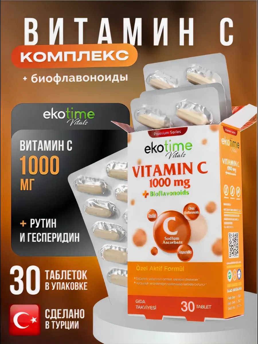 Vitamin C + Bioflavonoids from the Turkish brand EkoTime are dietary supplements with a unique formula, specially developed for those who value their health and want to strengthen their immune system. Vitamin C 1000 mg is known for its antioxidant and antiviral properties, which help protect human cells from free radicals and have an anti-inflammatory effect. Ascorbic acid is essential for collagen synthesis. Bioflavonoids, rutin, and hesperidin are natural compounds that enhance the protective functions of sodium ascorbate. These natural substances work synergistically, increasing effectiveness. This dietary supplement in tablet form improves the condition of the skin, bones, and joints, which is especially important during pregnancy. It has a positive effect on the functioning of the heart and blood vessels, protects against stress, and provides energy. The product maintains beautiful hair and nails. This beneficial product is certified and meets high quality standards. This vitamin complex is GMO-free, sugar-free, and gluten-free, making it suitable for a wide range of users, including those with special diets or dietary restrictions. Suitable for both men and women prone to frequent colds, acute respiratory infections, and flu. This dietary supplement is manufactured in Turkey. Pregnant women, children, and nursing mothers should consult a doctor before taking the capsules. This multivitamin will help adults, men, seniors, and teenagers stay strong and healthy. Start taking care of yourself today with Ecotime.