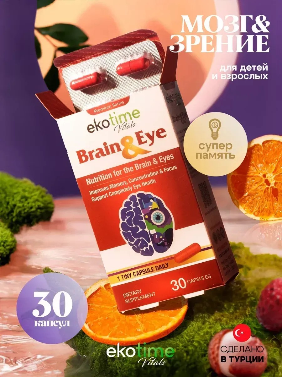 Brain & Eye от турецкого бренда EkoTime - сбалансированный витаминный комплекс, созданный специально для поддержания здоровья головного мозга и глаз человека. Каждая капсула содержит ряд активных веществ, в том числе L-тирозин, фосфатидилсерин, L-теанин и Q10, работающих вместе для улучшения памяти, когнитивных функций, внимания и концентрации. Гинкго билоба и готу кола известны положительным влиянием на мозговую активность и налаживают кровообращение. Витамин В12 - обязательный компонент для нормального функционирования нервной системы, производства энергии и синтеза ДНК. Предотвращает появление различных неврологических заболеваний у женской и мужской аудитории. Лютеин защищает глазную сетчатку от вредного воздействия ультрафиолетовых лучей и синего цвета. Сохраняет зрение и препятствует возникновению катаракты. Кофеин и холин ускоряют обработку информации, помогают бодрствовать и сосредотачиваться на задачах. Бад упрощает процессы обучения, способствуя лучшей учебной и профессиональной деятельности. Пищевая добавка полезна для взрослых женщин и мужчин, пожилых, подростков и детей. Complex не является лекарством. Беременным девушкам и кормящим мамам, перед началом приема таблеток, следует проконсультироваться с врачом. Комплексный препарат с b12 изготовлен в Турции и соответствует высоким стандартам качества. Удобная форма выпуска продукта позволяет принимать товар где угодно. Не упустите возможность заказать vitamin прямо сейчас. Начните заботиться о своем хорошем самочувствии уже сегодня!