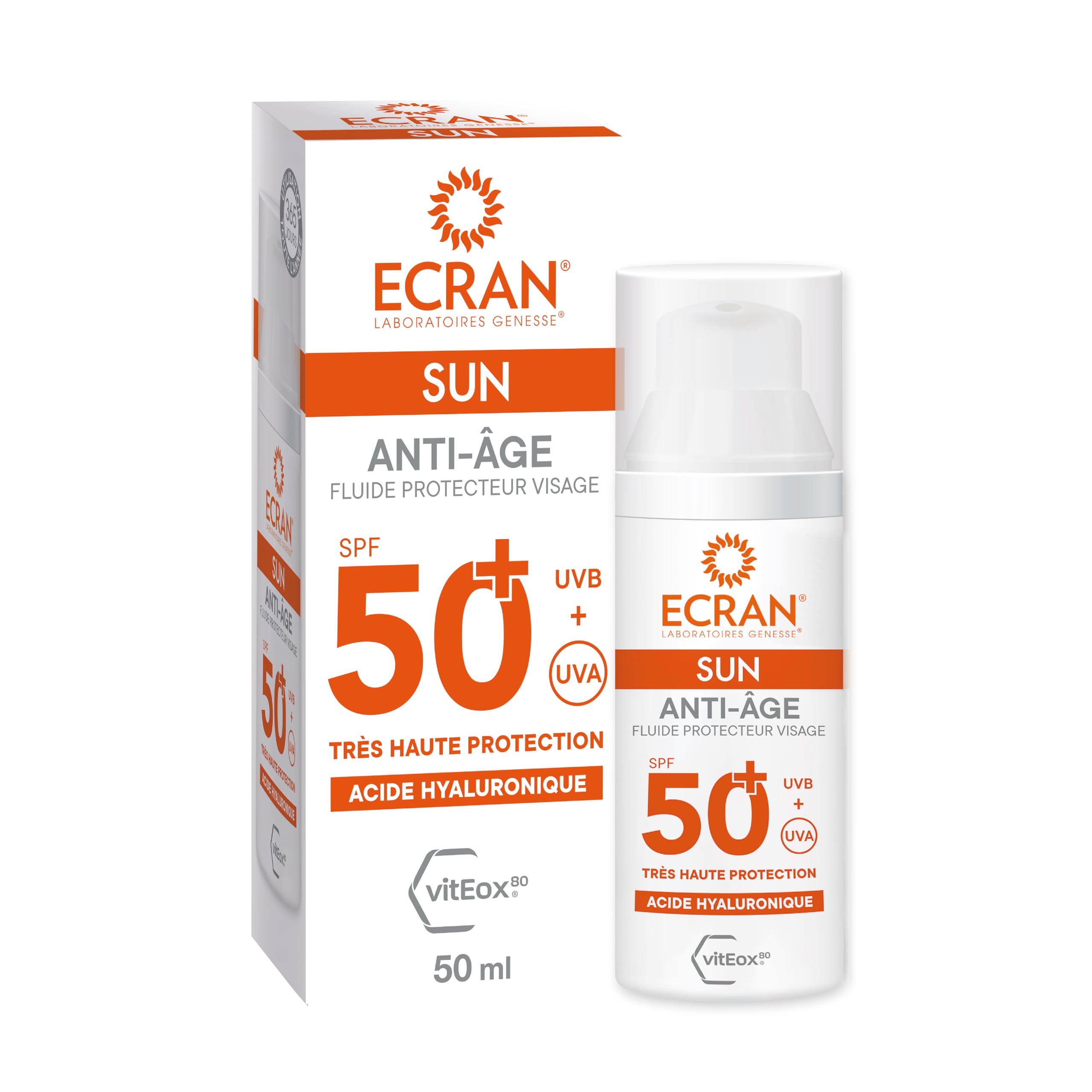 LA MARQUE ECRAN : Issue des Laboratoires Genesse, la marque ECRAN développe des produits de protection solaire dans le cadre d'une routine solaire en deux étapes : la protection durant l'exposition, et la réparation de la peau après l'exposition. EFFICACITE : Tous les produits ECRAN ont une efficacité cliniquement prouvée. La crème solaire visage anti-âge à l'Acide Hyaluronique convient à une utilisation quotidienne 365j par an, pour assurer une protection supérieure. FORMULE REVOLUTIONNAIRE VITEOX80 : Notre crème solaire associe vitEox80, molécule unique qui renforce les défenses antioxydantes de la peau, à l'Acide Hyaluronique qui hydrate intensément. Résultats visibles en 4 semaines. Formule non comédogène. HAUTE PROTECTION SPF50 : Cette protection solaire anti-âge protège contre les UVA, UVB, les effets indésirables des infrarouges, de la lumière bleue, et de la pollution. Elle prévient le vieillissement prématuré de la peau dû à l'exposition au soleil. CRÈME SOLAIRE VISAGE : La crème solaire visage SPF 50 s'appuie sur la technologie vitEox80. Elle protège des coups de soleil et renforce les défenses antioxydantes de la peau. Elle prévient et atténue les rides d'expression causées par le soleil.