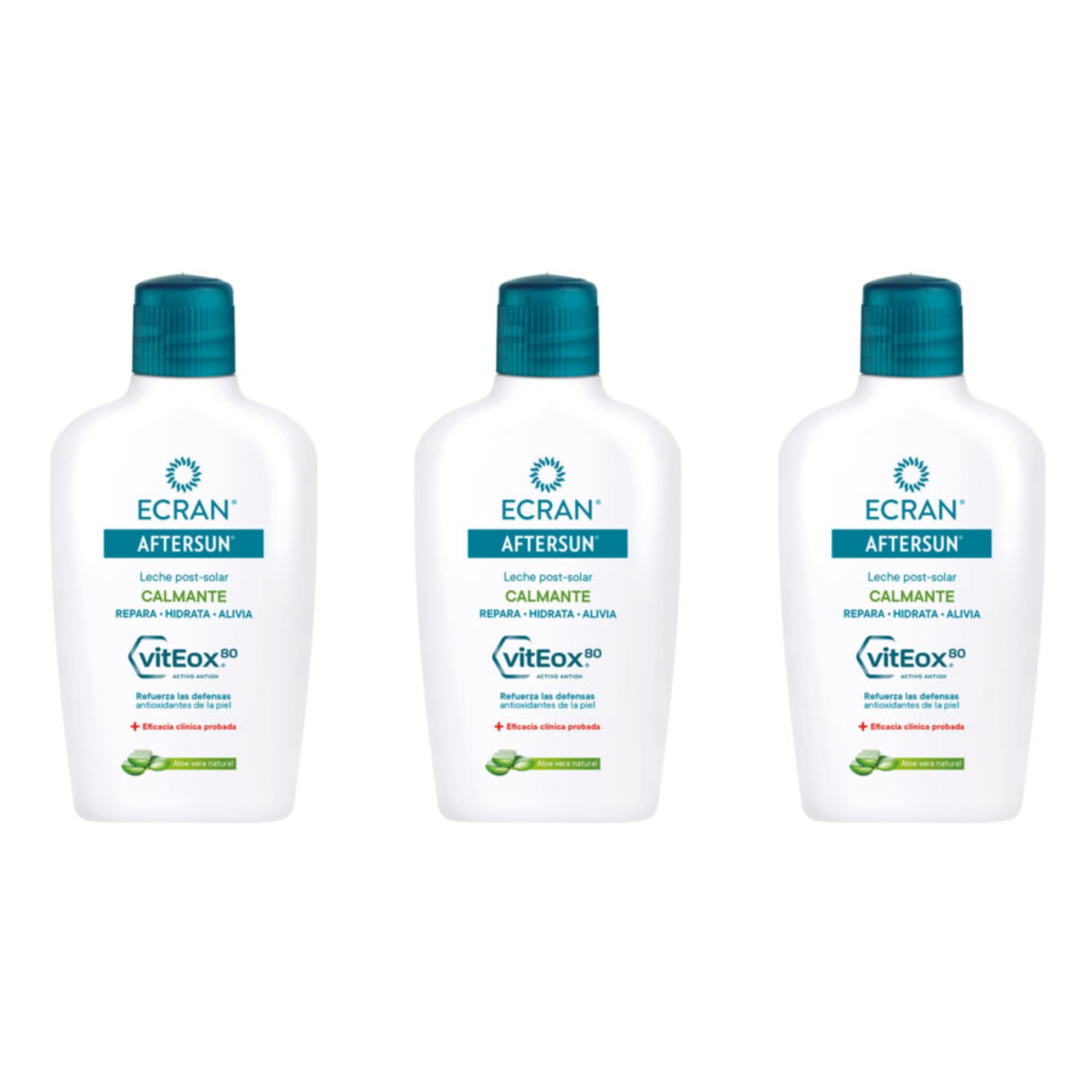 Discover the 3-pack of Ecran's Repairing and Soothing After-Sun Lotion, a restorative sunscreen lotion that hydrates and repairs skin after sun exposure. It strengthens the skin's antioxidant defenses, provides immediate relief, and doubles the cell repair capacity. Formulated with natural aloe vera and VitEox 80, it repairs sun damage and strengthens the skin's antioxidant defenses, while also preventing premature aging. Clinically proven efficacy and 100 recyclable packaging. SAFETY WARNING For external use only. Avoid contact with eyes. Keep away from fire or direct heat sources.ECRAN: We are much more than a sun protection brand we are pioneers in skincare. At Ecran, we are committed to offering you innovative and effective formulas that go beyond simple sun protection. Our wide range of products, from face and body sunscreens to after-sun and children's lines, guarantees complete protection for the whole family. Directions for use: After sun exposure, take a shower with lukewarm water to remove any remaining sunscreen, saltpeter, or sand. For clean, dry skin, apply a generous amount of Ecran AfterSun to the sun-exposed areas. Gently massage in using soft circular motions until fully absorbed. VITEOX 80: Thanks to its exclusive formula with VitEox 80 and aloe vera, Ecran's after-sun provides immediate relief and soothes skin after sun exposure. Ecran Soothing After-Sun repairs, hydrates, and strengthens the skin's antioxidant defenses. It also has a light, fast-absorbing texture. Ecran After-Sun: The new generation of after-sun lotions, thanks to its formula with VitEox 80, repairs sun damage and strengthens the skin's antioxidant defenses, in addition to preventing premature aging. Enriched with natural aloe vera, this Ecran after-sun moisturizes for 24 hours and prolongs your tan. Soothing After-Sun Lotion: Ecran's after-sun lotion is the perfect ally to soothe and repair your skin after a day in the sun. This moisturizing and repairing lotion hydrates and repairs the skin after sun exposure by strengthening its antioxidant defenses.Ecran - Lait post solaire hydratant et réparateur à l'aloe vera naturel, hydrate, apaise, soulage et répare, texture légère et absorption rapide, formule avec VitEox 80 - Pack de 3 x 200 mlDESCRIPTION DU PRODUIT DESCRIPTION DU PRODUIT Découvrez le pack de 3 de l'après-soleil réparateur et apaisant d'Ecran, un lait solaire réparateur qui crie, hydrate et répare la peau après l'exposition au soleil. Renforce les défenses antioxydantes de la peau, apporte un soulagement immédiat et double la capacité de réparation cellulaire. Formulé avec de l'aloe vera naturel, et avec VitEox 80 répare les dommages du soleil et renforce les défenses antioxydantes de la peau, en plus de prévenir le vieillissement prématuré. Efficacité cliniquement prouvée et avec un emballage 100 recyclable. AVERTISSEMENT DE SÉCURITÉ Pour usage externe uniquement. Éviter tout contact avec les yeux. Tenir à l'écart du feu ou des sources de chaleur directes.ECRAN: Nous sommes bien plus qu'une marque de protection solaire, nous sommes des pionniers dans les soins de la peau. Chez Ecran nous nous engageons à vous proposer des formules innovantes et efficaces qui vont au-delà de la simple protection solaire. Notre large gamme de produits, des crèmes solaires pour le visage et le corps à l'après-soleil et aux lignes spécifiques aux enfants, garantit une protection complète pour toute la famille. Mode d'emploi : après l'exposition au soleil, prenez une douche avec de l'eau tiède pour enlever les restes de crème solaire, de salpêtre ou de sable. Pour une peau propre et sèche, appliquez une quantité généreuse de Ecran AfterSun sur les zones exposées au soleil. Massez doucement pour étendre le produit avec des massages circulaires doux jusqu'à absorption complète. VITEOX 80 : Grâce à sa formule exclusive avec VitEox 80 et aloe vera, le post-solaire de Ecran apporte un soulagement immédiat et apaise la peau après le soleil. L'après-soleil Ecran apaisant répare, hydrate et renforce les défenses antioxydantes de la peau. En outre, il possède une texture légère et à absorption rapide. ECRAN AFTERSUN : La nouvelle génération de post solaires, grâce à sa formule avec VitEox 80, répare les dommages du soleil et renforce les défenses antioxydantes de la peau, en plus de prévenir le vieillissement prématuré. Enrichi en aloe vera naturel, cet après-soleil Ecran hydrate pendant 24 heures et maintient le bronzage plus longtemps. LAIT POSTSOLAIRE APAISANT : L'après-soleil de Ecran est l'allié parfait pour apaiser et réparer votre peau après une journée d'exposition au soleil. Ce lait hydratant réparateur, hydrate et répare la peau après l'exposition au soleil en renforçant les défenses antioxydantes de la peau.