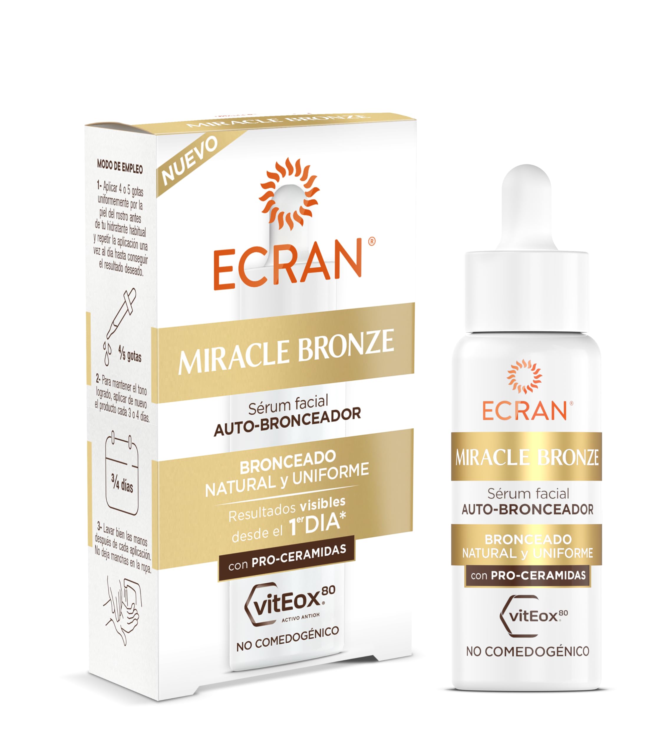 A natural, radiant, and even tan without sunbathing. With ECRAN Miracle Bronze Self-Tanning Facial Lotion, you can achieve a gradual, flawless golden tan while avoiding the harmful effects of UV radiation and maintaining healthy, well-cared-for skin. Thanks to its innovative formula with Pro-Ceramides, this self-tanner not only provides color but also hydrates and strengthens the skin, preventing dryness and leaving it soft and nourished. Furthermore, its VitEox80 antioxidant complex acts as a protective shield against premature aging and free radicals, bringing radiance and vitality to the face. Its ultra-light texture is perfect for daily use. It absorbs quickly, doesn't clog pores, and leaves no greasy or sticky residue. It doesn't dry out the skin or cause shine, making it ideal even for combination and oily skin. In addition, the color adapts to different skin tones, achieving a uniform and natural result without an orange tint. Lasting up to 4 days, this self-tanner won't stain clothes or leave streaks. It's quick and easy to apply: use 4 to 5 drops on clean, dry skin before your usual moisturizer and spread evenly. Repeat once a day until you achieve your desired shade and maintain the color by reapplying every 3 to 4 days. Remember to wash your hands thoroughly after application to avoid unwanted streaks. DIRECTIONS Apply 4 to 5 drops to clean, dry skin before your usual moisturizer and spread evenly. Repeat once a day until you achieve your desired shade and maintain the color by reapplying every 3 to 4 days. Wash your hands thoroughly after application. SAFETY WARNING Do not apply See moreGet your desired tan: With just 4 or 5 drops of our facial self-tanner on clean, dry skin before your usual moisturizer, you'll already notice the difference. You'll need to apply it once a day until you achieve your desired shade. Got it? Remember to repeat every 3 to 4 days to maintain it. Wash your hands thoroughly after application and you're ready to go for an even, radiant tan. Lasts up to 4 days: Your perfect tan, hassle-free. Its advanced technology allows the color to adapt to your skin tone, blending instantly and naturally for a tan that lasts up to 4 days without the need for constant touch-ups. Plus, it won't stain clothes or leave a patchy effect. A flawless, natural-looking tan without the effort. GRADUAL AND PROGRESSIVE TAN: Achieve a natural, gradual, and even tan without sun exposure. Its fast-absorbing technology guarantees an even, residue-free finish, adapting to all skin tones and types for a flawless result. Results from the first application. PRO-CERAMIDES FOR HYDRATED AND RADIANT SKIN: A tan isn't enough to make your skin beautiful. Your skin needs to be nourished and hydrated. That's why we developed its formula with Pro-Ceramides to give you extra reinforcement of the skin barrier, preventing dehydration, resulting in softer, more supple skin with a healthy glow. Your skin is tanned and cared for at the same time. NATURAL FACIAL TAN: Enjoy a golden, even tan without sun exposure. With the Miracle Bronze Self-Tanning Screen for the face, you'll enjoy a gradual, radiant tan from the very first application, avoiding UV damage and keeping your skin cared for at all times.ECRAN Miracle Bronze Autobronzant Visage Lotion bronzante avec Pro-Céramides Bronzage Naturel, Uniforme et Progressif Sans Soleil Texture Légère, Ne Sèche Pas Graisse 4 Jours 50 mlDESCRIPTION DU PRODUIT DESCRIPTION DU PRODUIT Un bronzage naturel, lumineux et uniforme sans avoir besoin de prendre le soleil. Avec l'ECRAN Miracle Bronze Autobronzant Facial, vous pouvez obtenir une teinte dorée progressive et sans imperfections, en évitant les effets néfastes du rayonnement UV et sans renoncer à une peau saine et bien entretenue. Grâce à sa formule innovante avec Pro-Ceramides, cet autobronzant fournit non seulement de la couleur, mais hydrate et renforce la peau, évitant le dessèchement et la laissant douce et nourrie. De plus, son complexe antioxydant VitEox80 agit comme un bouclier protecteur contre le vieillissement prématuré et les radicaux libres, apportant luminosité et vitalité au visage. Sa texture ultra légère est parfaite pour un usage quotidien. Absorbe rapidement, n'obstrue pas les pores et ne laisse aucune sensation grasse ou collante. Ne dessèche pas la peau et ne provoque pas de brillance, ce qui la rend idéale même pour les peaux mixtes et grasses. En outre, la couleur s'adapte à différents tons de peau, obtenant un résultat uniforme et naturel sans effet orange. D'une durée allant jusqu'à 4 jours, cet autobronzant ne tache pas les vêtements et ne laisse pas de patchs. Son application est simple et rapide : utilisez 4 à 5 gouttes sur une peau propre et sèche avant votre hydratant habituel et étalez uniformément. Répétez l'application une fois par jour jusqu'à obtenir la teinte désirée et maintenez la couleur en la réappliquant tous les 3 à 4 jours. N'oubliez pas de bien vous laver les mains après l'application pour éviter les marques indésirables. MODE D'EMPLOI Appliquez 4 à 5 gouttes sur une peau propre et sèche avant votre hydratant habituel et étalez uniformément. Répétez l'application une fois par jour jusqu'à obtenir la teinte désirée et maintenez la couleur en la réappliquant tous les 3 à 4 jours. Lavez-vous soigneusement les mains après l'application. AVERTISSEMENT DE SÉCURITÉ Ne pas appliquer Voir plusObtenez votre bronzage désiré : avec seulement 4 ou 5 gtas de notre autobronzant facial sur une peau propre et sèche avant votre hydratant habituel, vous remarquerez déjà le changement. Vous devrez l'appliquer une fois par jour jusqu'à ce que vous obteniez la teinte souhaitée. Vous l'avez ? N'oubliez pas de répéter tous les 3 à 4 jours pour l'entretenir. Lavez-vous soigneusement les mains après l'application et prêt à sortir pour un bronzage uniforme et radieux. Durée jusqu'à 4 jours : votre bronzage parfait, sans tra