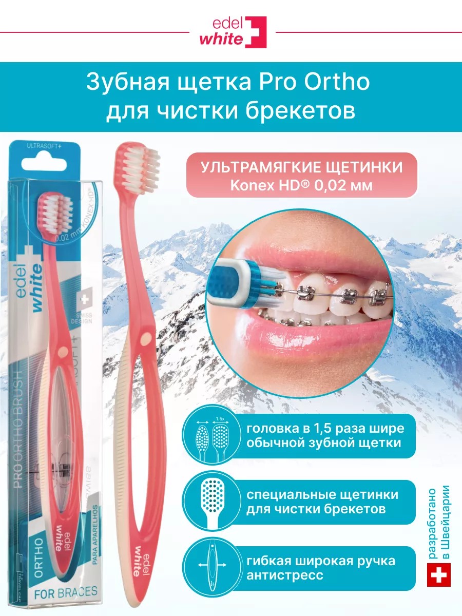 При ношении брекетов повышается риск развития кариеса. Связано это с более высоким уровнем налета, который накапливается вокруг брекетов, но качественный уход за полостью рта поможет избежать таких проблем.Уникальная зубная щетка Pro Ortho: - Для чистки зубов ультрамягкая щетина 0,02 мм.- Для чистки брекет-систем - жесткая щетина KONEX HD. - Головка зубной щетки шире обычной в 1,5 раза поэтому очищает брекеты, зубы и десны одновременно.- Состоит из 6 рядов и 36 пучков щетинок. - Внутренние щетинки глубоко очищают брекеты, а внешние линию десен. - Кончики щетинок очень гибкие, что помогает щетине адаптироваться к поверхности зубов, облегая их изгибы и проникая в межзубные промежутки. - Ручка антистресс поможет предотвратить излишнее давление на десны, зубы и брекеты.При чистке рекомендуется держать зубную щетку под углом 45 градусов к деснам, направляя ультрамягкую щетину к линии десен совместив жесткую среднюю щетину с брекетами.- **Разработана в Швейцарии.**.