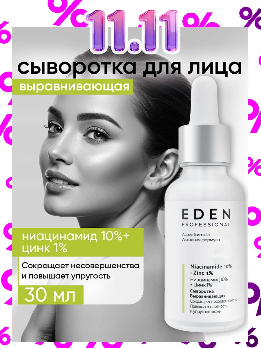 Сыворотка для лица выравнивающая с ниацинамидом и цинком EDEN PROFESSIONAL. сыворотка против пигментных пятен способствует выравниванию тона кожи, осветляет пигментные пятна, придает сияние. Себорегулирующая сыворотка обладает противовоспалительным и восстанавливающим эффектом. Сыворотка с ниацинамидом эффективно борется с расширенными порами, высыпаниями, выравнивая поверхность кожи. Уходовая антивозрастная косметика для кожи устраняет обезвоженность и уменьшает мелкие морщины. Сыворотка с цинком успокаивает покраснения и раздражение, ускоряет процесс восстановления кожи и способствует выработке коллагена.Cыворотка выравнивающая сокращает несовершенства, повышает плотность и упругость кожи. Сыворотка восстанавливающая. Уходовая сыворотка с ниацинамидом и цинком для лица для сужения пор, борьбы с акне и постакне - профессиональная концентрация активов. Профессиональная сыворотка для жирной, проблемной, комбинированной кожи лица с ниацинамидом 10% и цинком 1%,. Активная противовоспалительная сыворотка от акне, прыщей, комедонов, воспалений, угрей, против жирного блеска, от широких пор, от рубцов, пятен и следов постакне. Поросуживающая и тонизирующая сыворотка для сужения пор (матирующий эффект), средство против черных точек на лице и на носу, от угревой сыпи, от расширенных пор. Действует как средство для борьбы с несовершенствами молодой, юной кожи, а также подходит для выравнивания широких пор зрелой возрастной кожи, уменьшения морщин, стимуляции обновления и метаболизма зрелой кожи. Прекрасная альтернатива корейским сывороткам. Современная женская уходовая косметика может заменить женщинам многочисленные походы в салоны красоты. Способ применения: Ежедневно утром и/ или вечером наносите сыворотку на лицо, шею, зону декольте после очищения и тонизирования. Используйте сыворотку самостоятельно или перед основным средством ухода.
