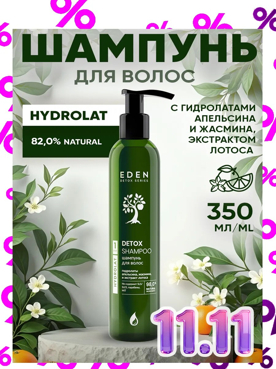 EDEN DETOX Hydrolat Shampoo is sulfate-free, moisturizing, and natural. It contains 98% natural ingredients, providing a powerful cleansing effect and conditioning. Orange and jasmine hydrolates contain bioflavonoids, vitamins, acids, glycosides, and phytoncides that tone the scalp, help combat hair loss, add shine, and hydrate. Pentavitin is a complex of plant carbohydrates and wheat extract that binds and retains moisture for a long time. It moisturizes hair, making it manageable and silky. Lotus extract refreshes and tones the scalp, detoxifies, and moisturizes hair. This sulfate-free shampoo is safe to use and suitable for sensitive and dry scalps and all hair types—colored and bleached, straight and curly, split ends and damaged, oily and dry. It's also suitable after keratin and Botox treatments. Its universal scent makes it suitable for both women and men. Does not contain: SLS, SLES, parabens, or MIT. For maximum effect, use with EDEN DETOX Hydrolat Conditioner.