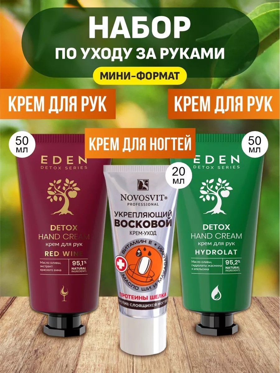 EDEN Detox крем для рук питательный Red Wine 50мл — это эффективное средство для ухода за кожей рук, которое обеспечивает увлажнение, питание и защиту. Крем для рук увлажняющий 95,1% натуральных ингредиентов.