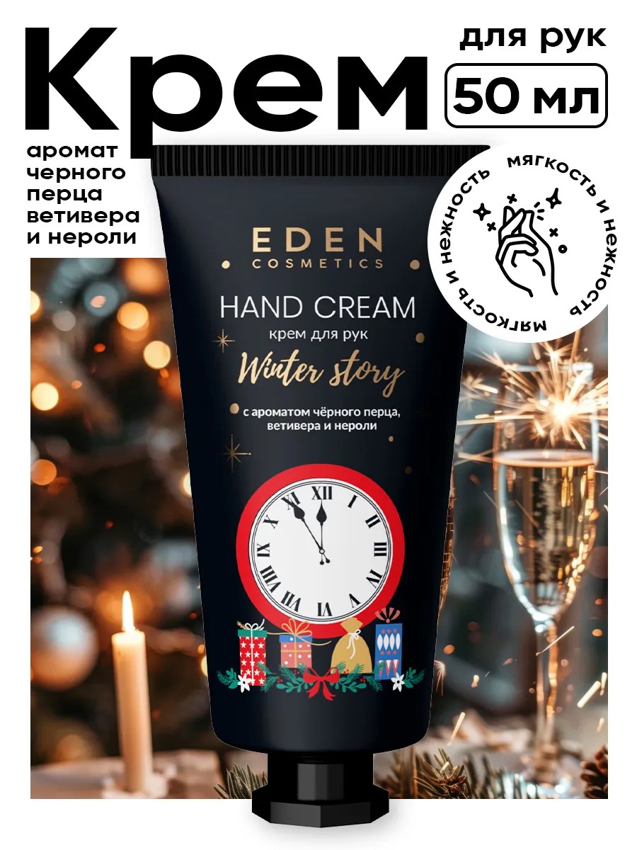 Крем для рук с ароматом черного перца, ветивера и нероли EDEN Winter story GOLDEN, 50мл. Увлажняющий и питательный крем для ухода за кожей рук подходит для ежедневного использования, особенно в зимний период. Приятный парфюмированный крем с запахом ветивера, нероли и черного перца, создает ощущение уюта и свежести. Формат мини удобен для переноски — маленький тюбик легко помещается в женской сумке или кармане, что позволяет всегда заботиться о коже рук вне дома. Hand cream увлажняющий обладает питательной текстурой, быстро впитывается, не оставляет липкости и ощущения пленки на поверхности кожи. Средство обогащено пантенолом, который способствует восстановлению сухой кожи рук, помогает снять раздражение и защищает от воздействия холода. Благодаря сбалансированной формуле коем для рук подходит даже для очень сухой кожи: он смягчает кутикулу и поддерживает эластичность кожи. Регулярное применение крема парфюмированного обеспечивает эффективный корейский уход за руками зимой, предотвращая появление шелушения, трещинок и обветривания. Крем для рук дорожного мини-формата незаменим в поездках и путешествиях: такой крем удобно брать с собой благодаря его компактности.
