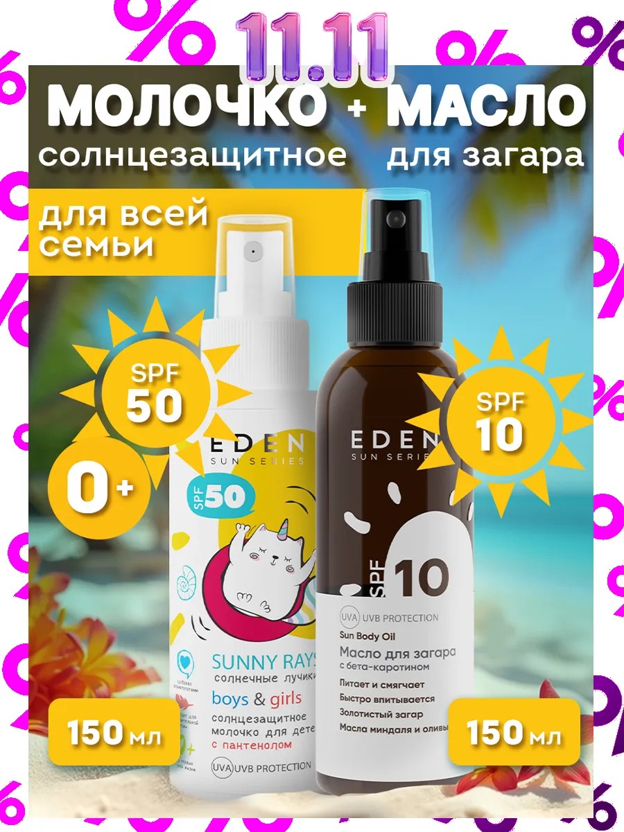 Introducing the EDEN sunscreen set – your reliable companion for a safe and pleasant tan! This set includes sunscreen milk for children from the first days of life SPF 50 (150 ml) and tanning oil with beta-carotene SPF 10 (150 ml).
