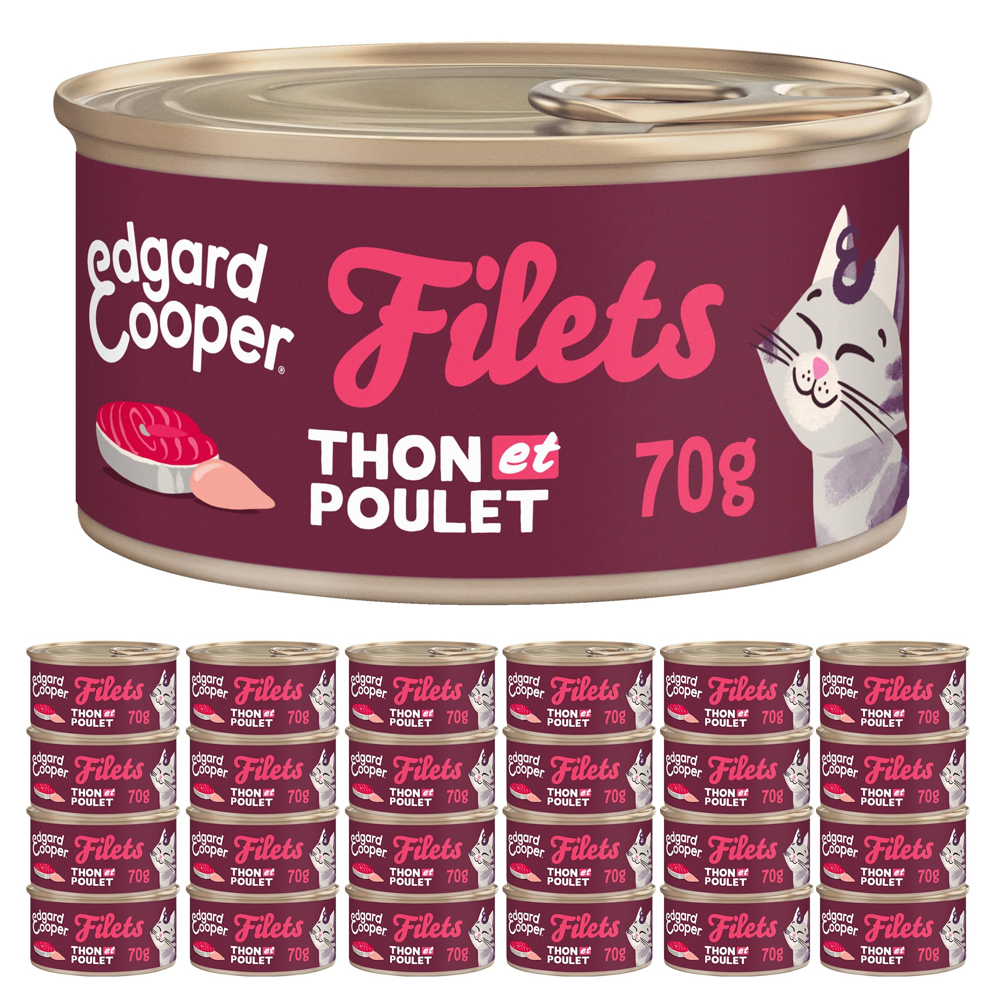 Delicious and healthy fillets for adult cats, with natural tuna and fresh chicken. A mouth-watering and easy-to-digest recipe prepared with care, using plenty of natural tuna and fresh chicken. These nets are perfect for a moment of indulgence for your cat. As always, we never use meat meal and nothing processed or dried – which also makes this food more nutritious and easy to digest. Ingredients tuna 60 , chicken 4 , fish broth. Directions You may have noticed: cats are picky eaters. Here are some tips for keeping yours happy and well-fed. Cats generally choose to eat smaller portions, more frequently. This is why we recommend that you always leave kibble in your cat's bowl, day and night. This way they can choose when and how much to eat. INGREDIENTS tuna 60 , chicken 4 , fish broth. DIRECTIONS FOR USE You may have noticed: cats are picky eaters. Here are some tips for keeping yours happy and well-fed. Cats generally choose to eat smaller portions, more frequently. This is why we recommend that you always leave kibble in your cat's bowl, day and night. This way they can choose when and how much to eat. Eco-friendly packaging! We use paper bags for our dry food, and our boxes and trays are fully recyclable. Friends support each other. We donate 1 of sales to our foundation to protect the welfare of pets worldwide. Only high-quality fresh fish with 0 added sugars. Prepare to be purred. Grain-free, gluten-free, and no added sugar wet cat food, perfect for sensitive stomachs. Suitable for all cats, from 2 months old, of all sizes and breeds, neutered and active. Natural wet cat food, tuna fillets and fresh chicken, no processed or dried food. Des filets délicieux et sains pour chats adultes, avec du thon naturel et du poulet frais. Une recette alléchante et facile à digérer préparée avec soin, en utilisant plein de thon naturel et du poulet frais. Ces filets sont parfaits pour un moment de gourmandise pour votre chat. Comme toujours, nous n'utilisons jamais de farine de viande et rien de transformé ou de séché – ce qui rend aussi cette nourriture plus nutritive et facile à digérer. Ingrédients thon 60 , poulet 4 , bouillon de poisson. Mode d'emploi Vous avez peut-être remarqué: les chats sont des mangeurs difficiles. Voici quelques conseils pour garder le vôtre heureux et bien nourri. Les chats choisissent généralement de manger de plus petites portions, plus fréquemment. C'est pourquoi nous vous recommandons de toujours laisser des croquettes dans la gamelle de votre chat, jour et nuit. De cette façon, ils peuvent choisir quand et quelle quantité manger. INGRÉDIENTS thon 60 , poulet 4 , bouillon de poisson. MODE D'EMPLOI Vous avez peut-être remarqué: les chats sont des mangeurs difficiles. Voici quelques conseils pour garder le vôtre heureux et bien nourri. Les chats choisissent généralement de manger de plus petites portions, plus fréquemment. C'est pourquoi nous vous recommandons de toujours laisser des croquettes dans la gamelle de votre chat, jour et nuit. De cette façon, ils peuvent choisir quand et quelle quantité manger. Des emballages respectueux de l'environnement! Nous utilisons des sacs en papier pour nos aliments secs et nos boîtes et barquettes sont entièrement recyclables. Entre copains, on se soutient. Nous reversons 1 des ventes à notre fondation pour protéger le bien-être des animaux de compagnie dans le monde entier. Uniquement du poisson frais de haute qualité avec 0 de sucres ajoutés. Préparez-vous à un concert de ronrons. Nourriture humide pour chats sans céréales, sans gluten et sans sucres ajoutés, parfait pour les estomacs sensibles. Convient à tous les chats, à partir de 2 mois, de toutes tailles et races, stérilisés et actifs. Nourriture humide naturelle pour chats, filets à base de thon et poulet frais, sans aliments transformés ou séchés.