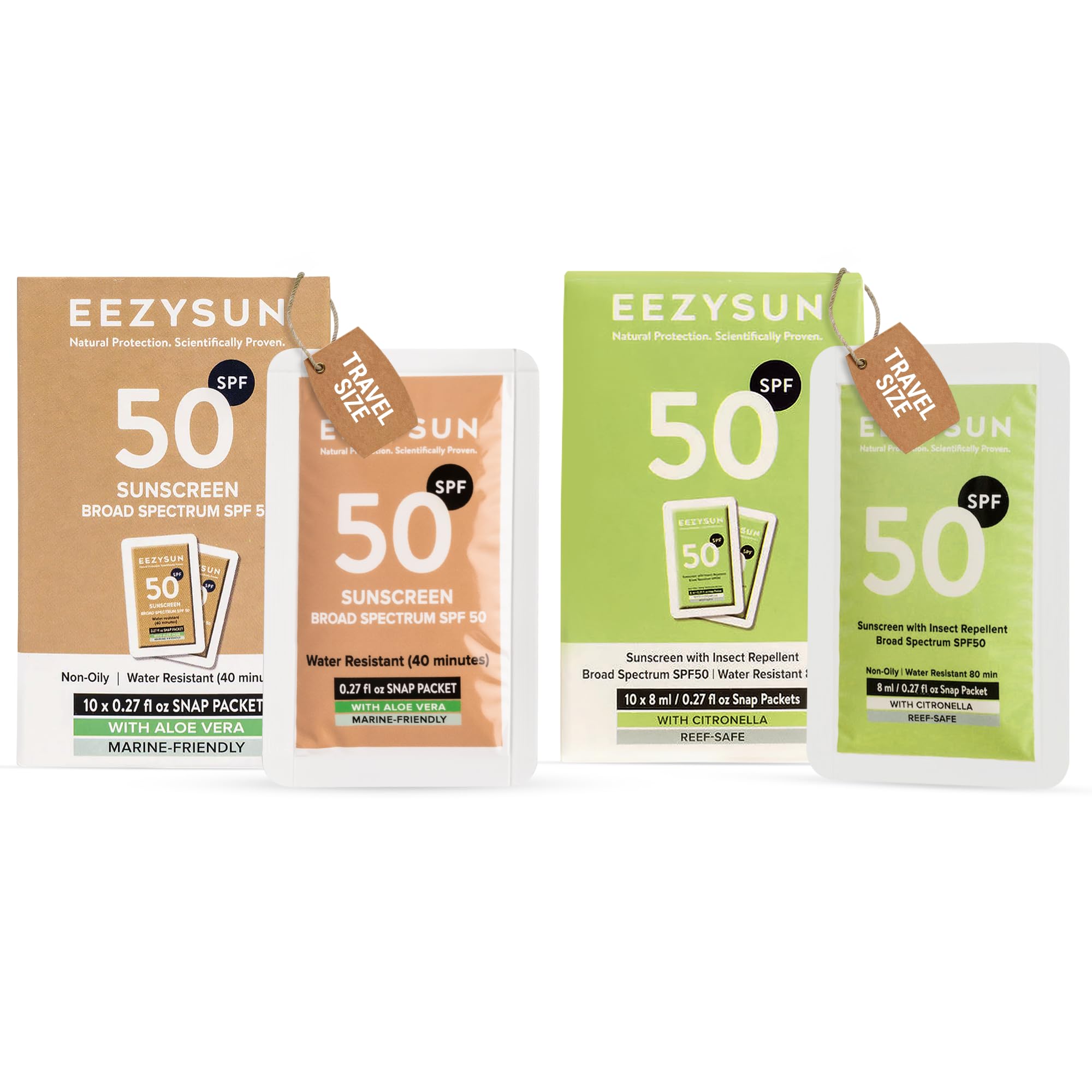 EEZYSUN Mineral SPF 50 Travel Sunscreen & Insect Repellent Snap Packets | Aloe Vera Citronella Lemongrass & Neem Oil | Vegan Reef-Safe Non-Oily Broad Spectrum UVA/UVB | 10 Pack (0.27 fl oz each)