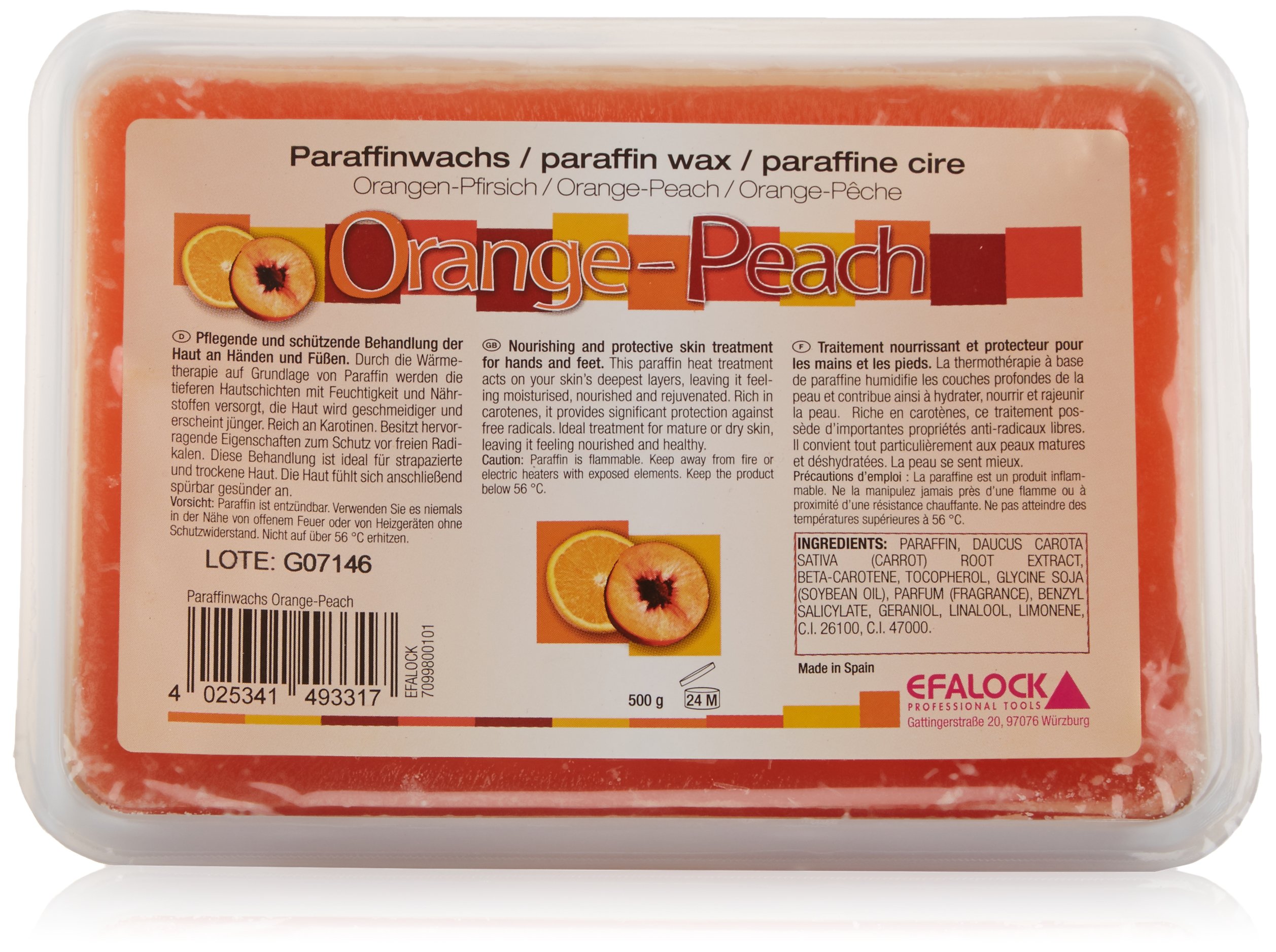 Scope of delivery: Efalock paraffin wax Orange-Peach, 1er Pack (1 x 0.5 kg).Gives moisture.Gives a soft, smooth appearance.Renew the skin.