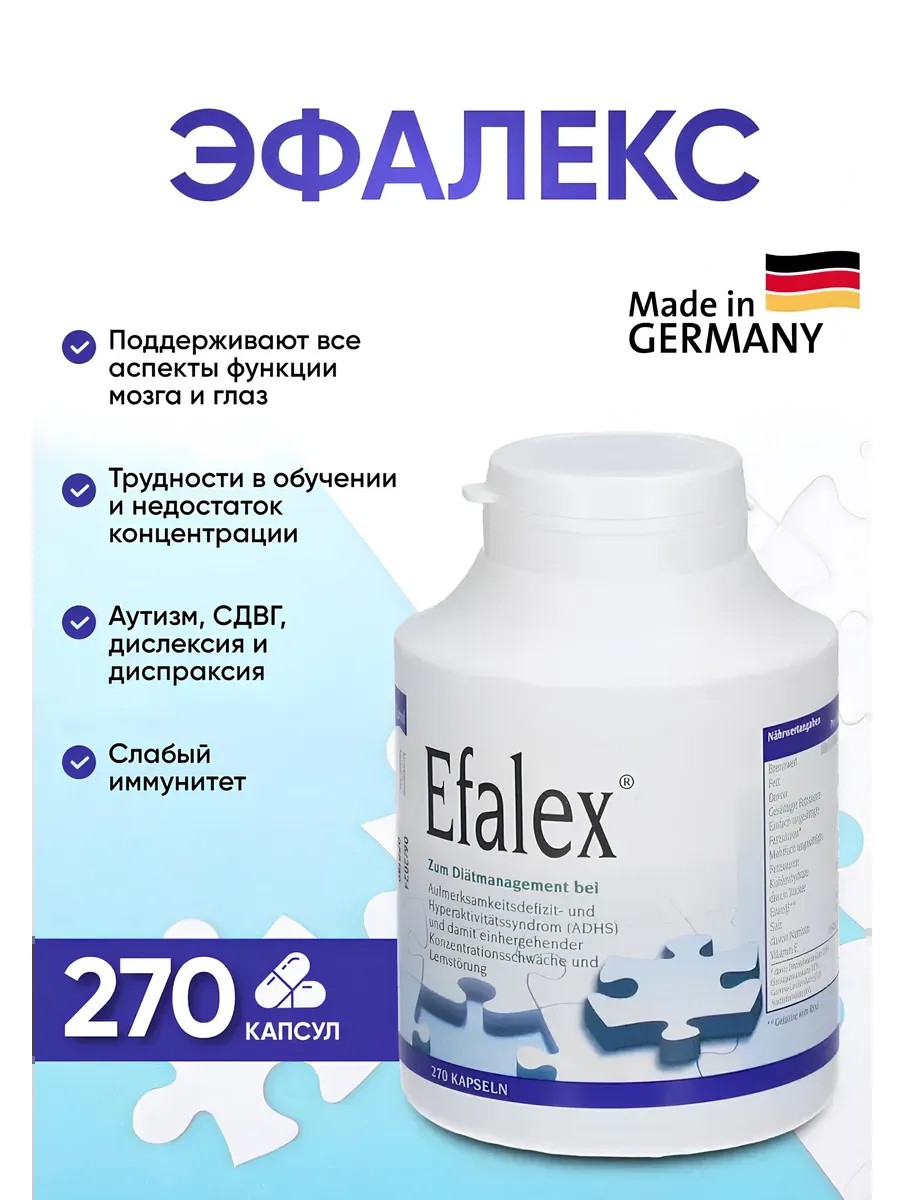 Efalex капсулы (Германия) – мощная поддержка мозга, зрения и иммунитета для детей и взрослых. Efalex от Efamol – это высококачественная добавка к пище с комплексом омега-3 и омега-6, разработанная для улучшения мозговой деятельности, зрения и общего здоровья. Произведенный в Германии, Efalex содержит сбалансированное сочетание жидкого рыбьего жира, и витамина Е, что делает его идеальным для детей с синдромом дефицита внимания и гиперактивности, а также для взрослых, нуждающихся в поддержке памяти и концентрации. Сироп полезен для детей, так как Омега-3 поддерживает здоровое развитие мозга, улучшает концентрацию и способствует укреплению зрения. Благодаря Омега-3 и витамину Е, легко усваивается и обеспечивает максимальную пользу для организма, помогает восполнить дефицит жизненно важных жирных кислот, необходимых для работы мозга и нервной системы. Efalex особенно полезен для детей от 1 года, а также подростков и взрослых, с проблемами концентрации и ослабленной памятью. Этот сироп полезен и для женщин и мужчин повышая устойчивость к стрессам. Содержит жидкий рыбий жир, богатый омега-3. Витаминный комплекс поддерживает иммунитет у женщин и детей, помогая в защите клеток от повреждений. Витамин Е поддерживает здоровье глаз, зрение, а также укрепляет иммунитет. Подходит для детей и для взрослых, включая подростков, пожилых женщин и мужчин. Выпускается в виде капсул для легкого усвоения – особенно удобно для детей. Подходит для детей и взрослых с повышенной чувствительностью к продуктам питания. Эфалекс эффективен при повышенной умственной нагрузке у взрослых, нуждающихся в поддержке когнитивных функций. Efalex – натуральное средство для поддержки здоровья, это больше, чем просто рыбий жир, это лечебное питание для здоровья всей семьи.