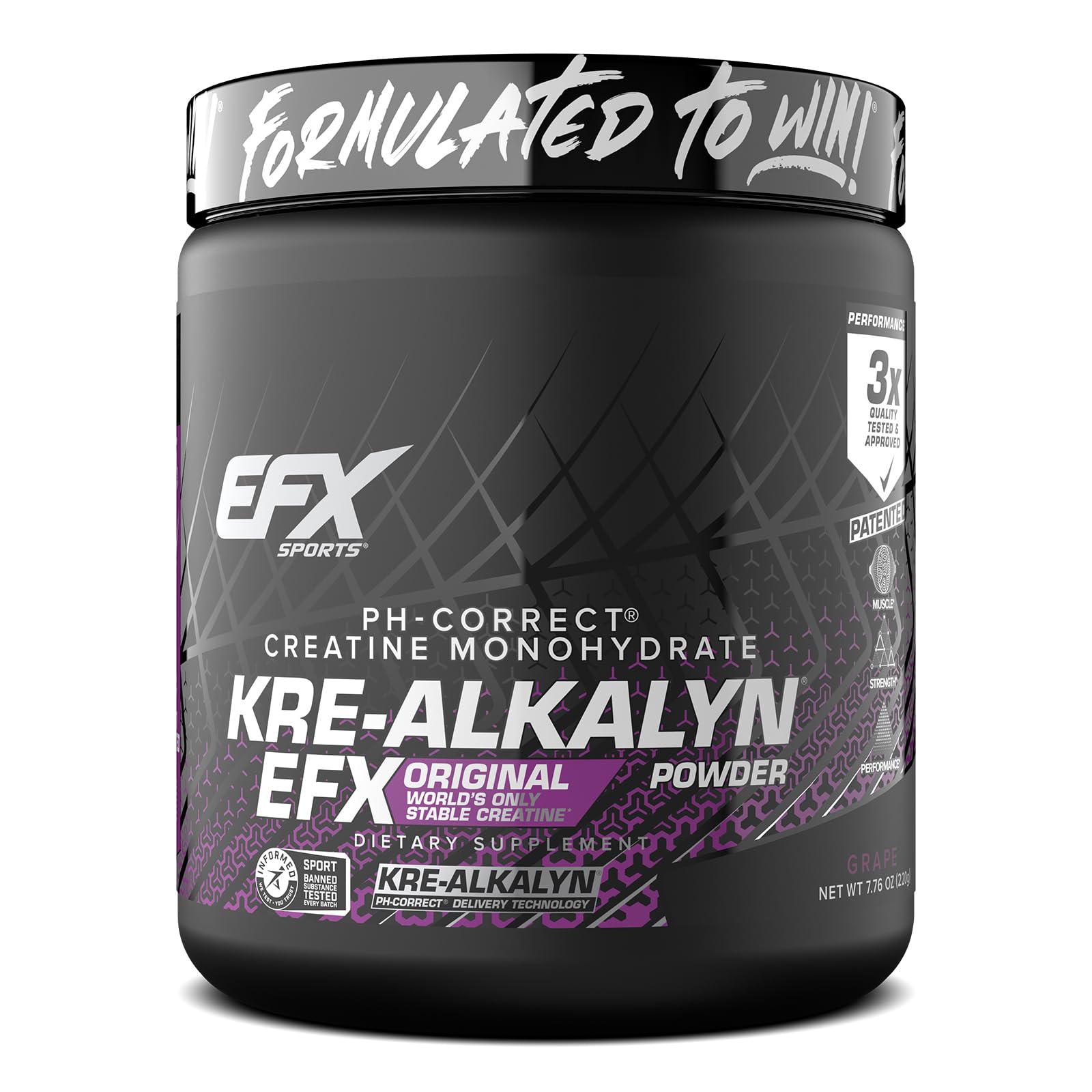 3X QUALITY TESTING: At EFX Sports, we proudly own every phase of the manufacturing process to ensure what's on the label is what's in the bottle.without question. In fact, every EFX Sports product must pass 3 critical quality checkpoints—before, during and after production. MANUFACTURED IN-HOUSE: EFX Sports is part of a very small, elite group of brands who actually make their own products. That's why we guarantee Kre Alkalyn EFX always meets label claims and is 100 banned-substance free (certified by Informed Sport). With any EFX Sports product, you'll know that you're getting a pure, potent, and safe product. MIX ENJOY: Our Kre Alkalyn EFX creatine powder easily mixes in water or your favorite drink for maximum strength and performance, no matter your fitness goals. Try one of our delicious fruity flavors or enjoy the classic unflavored powder before or after any intense training session. Just scoop, mix, and get to work!. CRUSH YOUR STRENGTH GAINS: Creatine monohydrate is the single most studied sports supplement ever. It's the top pre- and post- workout compound for athletes and bodybuilders who want to gain muscle mass, increase power, enhance performance, and accelerate muscle recovery. Kre Alkalyn EFX is 99.9 pure creatine monohydrate—science-backed, clinically tested, and safe. MULTI-PATENTED PH-CORRECT CREATINE by Dr. Jeff Golini: Kre Alkalyn EFX offers a superior alternative to other creatine products. Traditional creatine supplements have pH levels below 7, which immediately begin converting to creatinine — a useless waste product — when mixed with a solution. Kre Alkalyn EFX, however, has a multi-patented pH range of 12-14, resulting in a buffered, stable creatine monohydrate. This means you only need 1.5-3 grams with no loading, no bloating, and no side effects!.