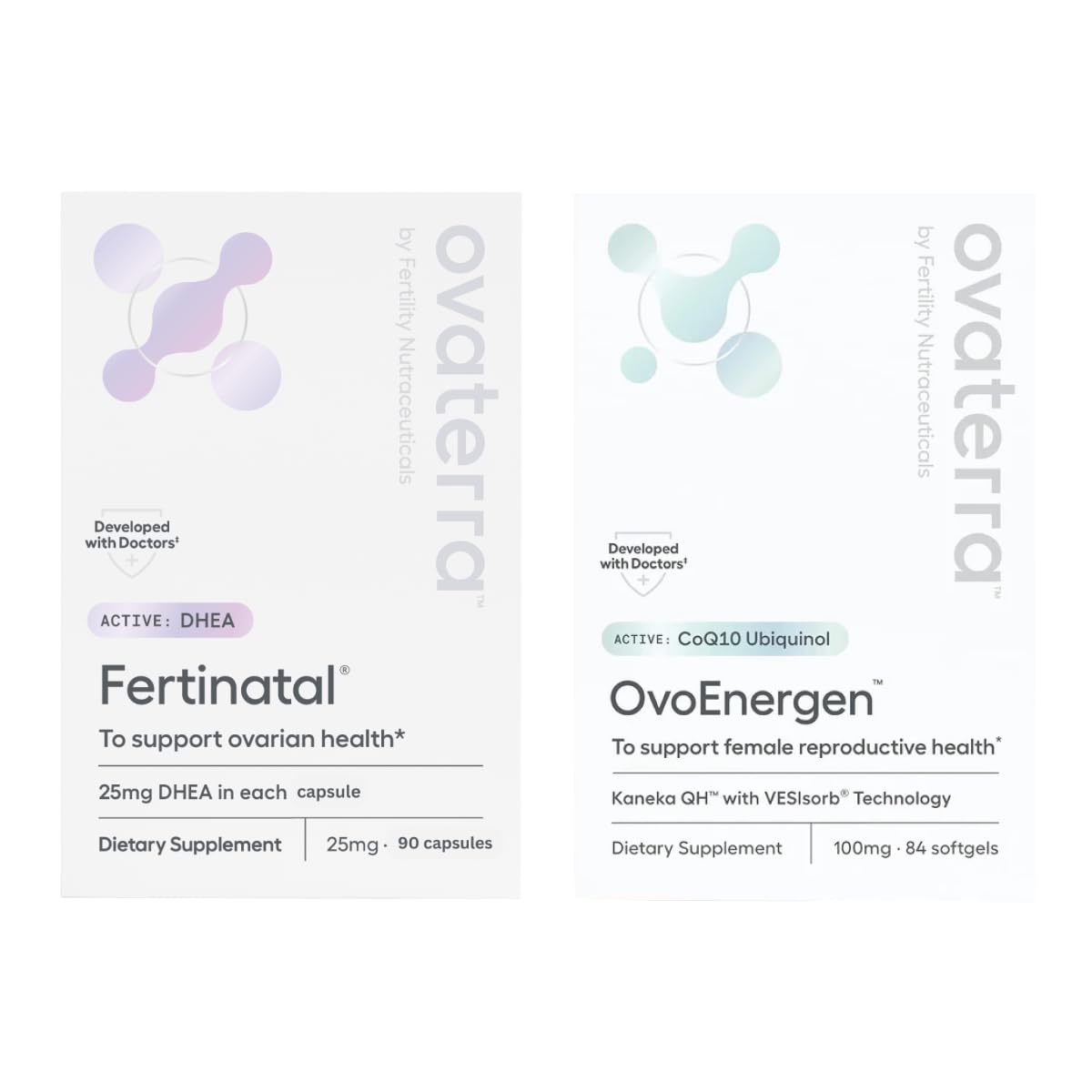 Unlock the power of egg health and fertility support with the Egg Health Power Pack for Women, featuring OvoEnergen CoQ10 Ubiquinol and Ovaterra Micronized DHEA. This expertly crafted bundle is designed to promote optimal reproductive wellness, enhance egg quality, and support hormonal balance, making it an ideal choice for women preparing for conception. OvoEnergen CoQ10 Ubiquinol delivers 100mg of clinical-grade ubiquinol per softgel, utilizing advanced VESIsorb technology for superior absorption and bioavailability. Developed in collaboration with leading reproductive health specialists, this supplement supports mitochondrial function, which plays a crucial role in maintaining egg quality and overall reproductive health. With its high-absorption formula, OvoEnergen helps optimize fertility and egg health in women of all ages. Ovaterra Micronized DHEA features 25mg of pharmaceutical-grade DHEA derived from plant sources. Designed to support ovarian reserve and reproductive hormone balance, this supplement was formulated with input from the renowned Center for Human Reproduction. Clean, non-GMO, and vegan-friendly, it provides 75mg daily for optimal support in egg and reproductive health. Both products are manufactured to the highest standards, meeting GMP and NSF certifications, and undergo rigorous third-party testing to ensure quality, safety, and efficacy. Together, they offer a comprehensive, science-backed solution to help women on their fertility journey. Consult with your healthcare provider to personalize your supplementation plan and make the most of this powerful egg health and fertility bundle.Premium Quality and Safety: Both supplements are manufactured under GMP and NSF-certified facilities, non-GMO, vegan, and rigorously third-party tested to ensure the highest standards of quality, safety, and efficacy. Expert-Backed Formulations: Developed in collaboration with leading reproductive health specialists and fertility researchers, this bundle is scientifically designed to support women on their journey to conception. Hormonal Balance and Ovarian Reserve: Ovaterra's Micronized DHEA provides 25mg of pharmaceutical-grade DHEA per capsule, supporting hormonal balance and ovarian reserve, crucial for reproductive wellness. Enhanced Mitochondrial Function for Egg Quality: OvoEnergen delivers 100mg of high-absorption ubiquinol CoQ10 per softgel, using VESIsorb technology to optimize mitochondrial health and promote egg health and reproductive system balance. Comprehensive Egg Health Support: The Egg Health Power Pack combines OvoEnergen CoQ10 Ubiquinol and Ovaterra Micronized DHEA, offering dual-action support for reproductive health, fertility, and optimal egg quality.