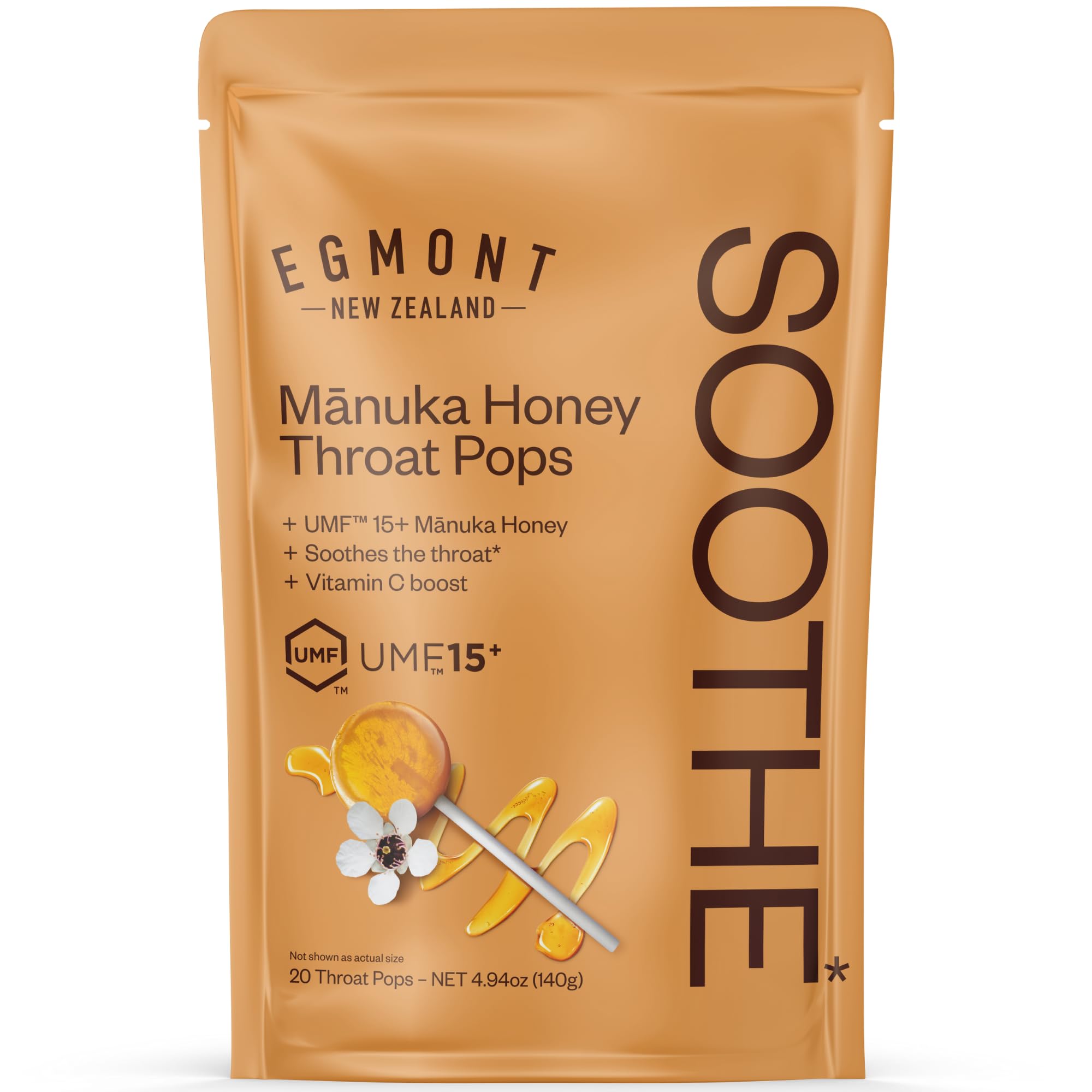 Egmont Honey Manuka Honey Throat Pops 20 Count | UMF 15+ New Zealand Honey with Vitamin C | Natural Soothing Lollipops for Kids & Adults