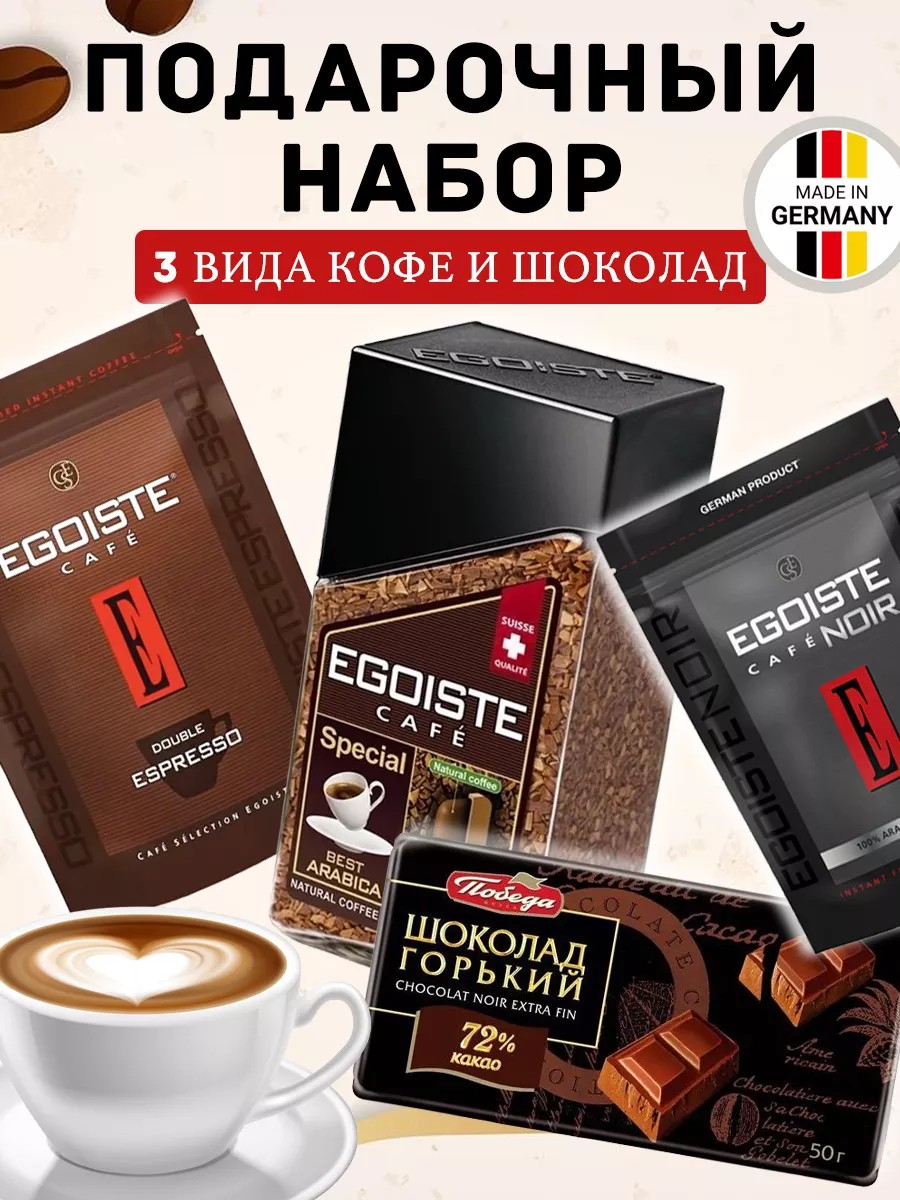 | Комплектация | кофе double espresso; кофе egoiste noir; кофе egoiste special; шоколад победа вкуса; подарочная коробка; атласная лента; открытка комплимент |
