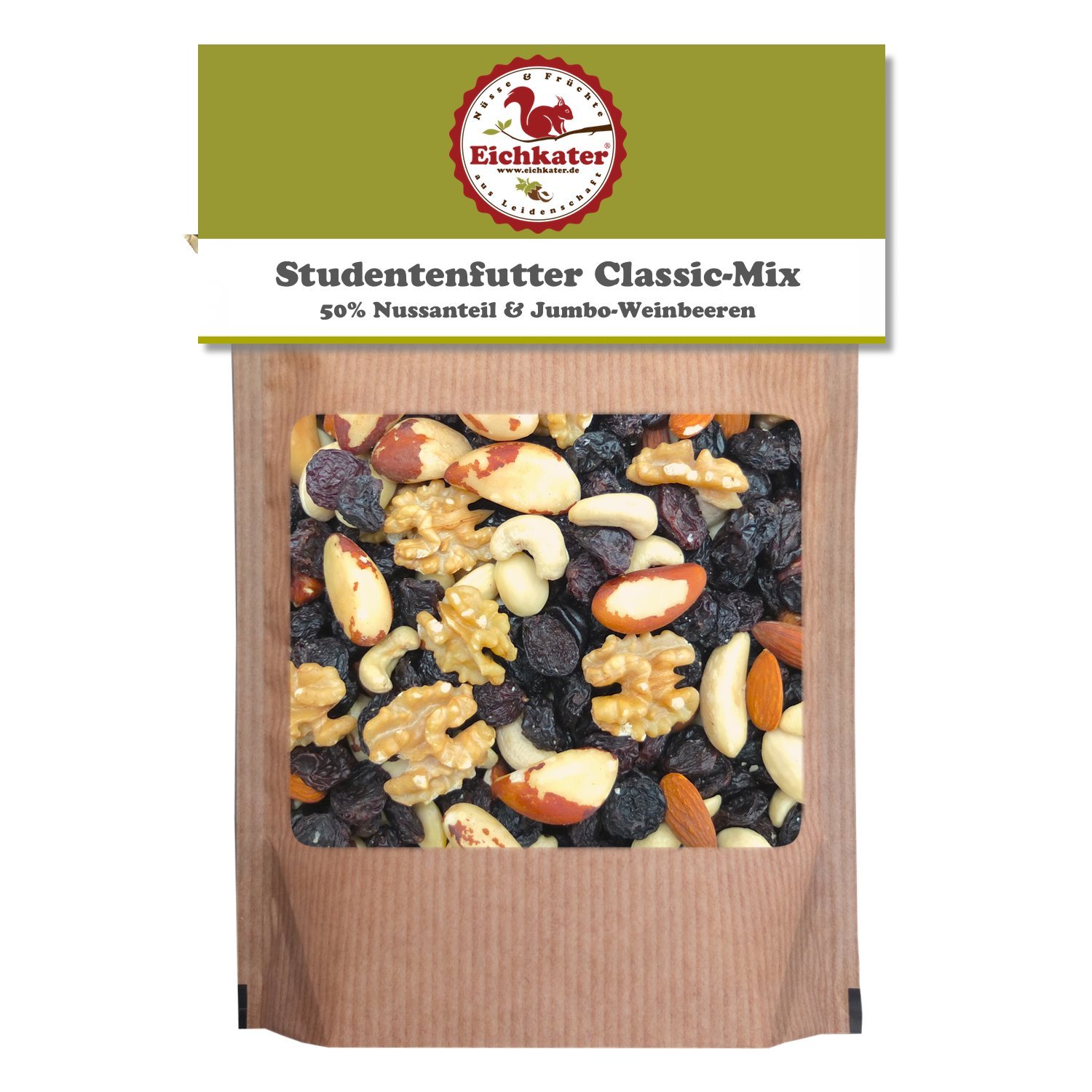 This balanced fruit-nut mix is a top-class student food.Wine berries, paranese, cashew nuts, walnuts, white and brown almonds and delicious hazelnuts ensure a nutty-sweet taste experience.The student feed ""Extra class"" supplies the body with important vital substances and fresh power in the head and body.Enjoy the student food extra class in between as a snack or refine baked goods, mueslis and yoghurts.Eichbel guarantees a high quality of all nut and fruit products through the goods cover with selected suppliers or by direct reference to the products from the producer.Eichbel is a small manufacturing operation, are compiled and packed in Germany and the ingredients from nuts and fruits are handpicked. Ingredients ingredients (Note: Allergenes in City Came) dried, nut kernels (in different weight components: parannic kernels, cashew nuts, walnut kernels, almonds brown, almond white, hazelnut kernels), vegetable oil Nutritional information: condensing 1 in KJ: 1937 Boil value 2 in Kcal: 464 Fat: 25.1g saturated fatty acids: 3.6g Carbohydrates: 47.8g Of which sugar: 34.2g Fiber: 5.5g Protein: 9g Salt: 0.02g Warnings Important note: The product can contain traces of other nuts such as peanuts and natural foreign material.When consuming nuts, swallowing is possible.Pay attention to your children. MoreEichkater is a small family factory in the state of Brandenburg and stands for very high quality and freshness of all nuts, dried fruit and nut mixes.The goods are covered with selected suppliers and in the direct reference to producers who have convinced the Eichkater team with the quality of the products.Your order is picked up handpicked after the order receipt.The expiry date is at least 6 months.Our aroma protection packaging is re -lockable and thus protects the freshness and aroma of the nuts and dried fruit.The Eichbel Student Feed Classic-Mix contains numerous minerals, vitamins and trace elements, including calcium, iron, vitamin A, E and numerous B vitamins.A nut-fruit mixture of the extra class.High quality nuts and large, dark, fruity, sweet wineberries.Enjoy the student food extra class in between as a snack or refine baked goods, mueslis and yoghurts.The most important nutrient of student food is the omega-3 fatty acids, which can only be absorbed through food.Student food classic mix with a high nut part jumbo wine berries from Eichkater.This balanced fruit-nut mix is a top-class student food.Large, dark, fruity wineberries, parannas, cashew nuts, walnuts, white and brown almonds and delicious hazelnuts ensure a nutty-sweet taste experience.Dieser ausgewogene Früchte-Nüsse-Mix ist ein Studentenfutter der Extraklasse. Weinbeeren, Paranüsse, Cashewkerne, Walnüsse, weiße und braune Mandeln sowie leckere Haselnüsse sorgen für ein nussig-süßes Geschmackserlebnis. Das Studentenfutter "Extra Klasse" versorgt den Körper mit wichtigen Vitalstoffen und frischer Power im Kopf und Körper. Genießen Sie das Studentenfutter Extra Klasse Zwischendurch als Snack oder verfeinern Sie damit Backwaren, Müslis und Joghurts. Eichkater garantiert eine hohe Qualität aller Nuss- und Fruchtprodukte durch den Warenbezug bei ausgewählten Lieferanten oder durch den Direktbezug der Produkte vom Erzeuger. Eichkater ist ein kleiner Manufakturbetrieb, werden in Deutschland zusammengestellt sowie verpackt und die Zutaten aus Nüssen und Früchten sind handverlesen. INHALTSSTOFFE ZUTATEN (Hinweis: Allergene in Großschreibung) Weinbeeren getrocknet, Nusskerne (in verschiedenen Gewichtsanteilen : PARANUSSKERNE, CASHEWKERNE, WALNUSSKERNE, MANDELN braun , MANDELN weiß, HASELNUSSKERNE), pflanzliches Öl Nährwertangaben: Brennwert 1 in kJ: 1937 Brennwert 2 in kcal: 464 Fett: 25,1g davon gesättigte Fettsäuren: 3,6g Kohlenhydrate: 47,8g davon Zucker: 34,2g Ballaststoffe: 5,5g Eiweiß: 9g Salz: 0,02g WARNHINWEISE Wichtiger Hinweis: Das Produkt kann Spuren von anderen Nüssen wie z.B. Erdnüssen und natürliches Fremdmaterial enthalten. Beim Verzehr von Nüssen ist ein verschlucken möglich. Achten Sie auf Ihre Kinder. MehrEichkater ist eine kleine Familienmanufaktur im Land Brandenburg und steht für eine sehr hohe Qualität und Frische aller Nüsse, Trockenfrüchte und Nussmischungen. Der Warenbezug erfolgt bei ausgesuchten Lieferanten und im Direktbezug bei Erzeugern, welche das Team von Eichkater durch die Qualität der Produkte überzeugt haben. Die Kommissionierung Ihrer Bestellung erfolgt handverlesen nach Bestelleingang. Das Haltbarkeitsdatum beträgt mindestens 6 Monaten. Unsere Aromaschutzverpackung ist wiederverschließbar und schützt so die Frische und das Aroma der Nüsse und Trockenfrüchte. Das Eichkater Studentenfutter Classic-Mix enthält zahlreiche Mineralstoffe, Vitamine und Spurenelemente, darunter Calcium, Eisen, Vitamin A, E und zahlreiche B-Vitamine. Eine Nuss-Fruchtmischung der Extra-Klasse. Nüsse in hoher Qualität und große, dunkle, fruchtig, süße Weinbeeren. Genießen Sie das Studentenfutter Extra Klasse Zwischendurch als Snack oder verfeinern Sie damit Backwaren, Müslis und Joghurts. Zum wichtigsten Nährstoff von Studentenfutter zählen die Omega-3-Fettsäuren, die nur über die Nahrung aufgenommen werden können. Studentenfutter Classic-Mix mit hohem Nussanteil Jumbo-Weinbeeren von Eichkater. Dieser ausgewogene Früchte-Nüsse-Mix ist ein Studentenfutter der Extraklasse. Große, dunkle, fruchtige Weinbeeren, Paranüsse, Cashewkerne, Walnüsse, weiße und braune Mandeln sowie leckere Haselnüsse sorgen für ein nussig-süßes Geschmackserlebnis.Eichkater Studentenfutter Classic-Mix 1er-Pack (1x750g) 1x750 g