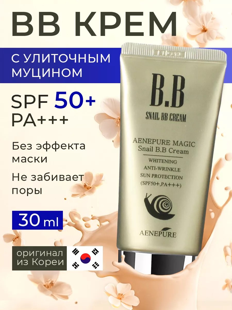 BB крем солнцезащитный омолаживающий с улиточным муцином Magic Snail BB Cream SPF50+ PA+++ 50 мл. Для создания идеального декоративного покрытия на зрелой кожи многие девушки выбирают корейскую разработку - ВВ крем Ekel Aenepure Snail BB Cream SPF 50 PA. Этот продукт дополнительно ухаживает и восстанавливает эпидермис. Представлен в универсальном тоне, который индивидуально подстраивается под оттенок кожи. Помогает качественно скрыть все несовершенства, создать ровный тон лица и при этом сохранить естественность.Какие проблемы решает:УвлажнениеПитаниеНеравномерный тонФормула обогащена улиточным муцином - эффективным омолаживающим компонентом. Нежная текстура глубоко питает и увлажняет кожный покров, улучшает регенерацию клеток и предотвращает обезвоживание. Консистенция быстро впитывается, хорошо перекрывает высыпания. Подходит для ежедневного применения и легко смывается. ВВ крем имеет солнцезащиту РА +++, которая убережет от негативного влияния ультрафиолетовых лучей. Состав: вода, глицерин, стеариновая кислота, циклопентасилоксан, диметиконол, натрия хлорид, гидроксиэтилцеллюлоза, феноксиэтанол, триэтаноламин, цинка оксид, каприловый триглицерид, аденозин, натрия гиалуронат, циклометикон, арбутин, сорбитан сесквикаприлат, бутилгидрокситолуол, диоксид титана