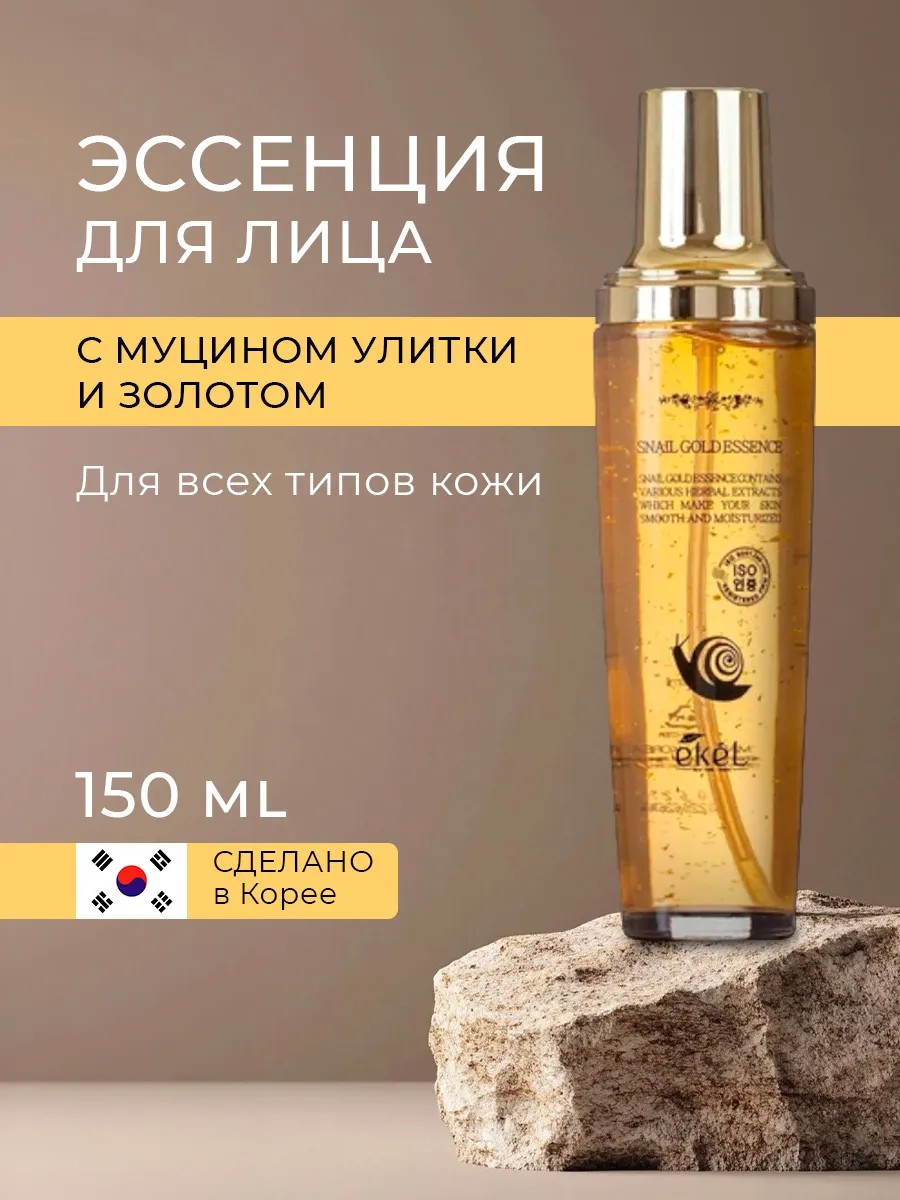 Snail Gold Essence, a moisturizing, anti-wrinkle facial essence with gold and snail mucin, 150 ml. Ekel Snail Gold Essence, enriched with a unique complex of gold and snail mucin, provides anti-aging skin care. The product boasts a high concentration of active ingredients, enhancing and accelerating the formula's action. It is designed to moisturize, nourish, and accelerate cell regeneration. It addresses: Signs of aging, malnutrition, and dehydration. The main ingredient is snail mucin extract, which promotes intensive skin cell regeneration. It helps the epidermis obtain the necessary moisture and nutrients. Gold acts as a conductor of the active ingredients and enhances the product's rejuvenating effect. It improves the elasticity and firmness of the dermis and prevents the appearance of new signs of aging. Suitable for daily home care. Ingredients: Water, Glycerin, Fragrance, Propylene Glycol, Allantoin, Alcohol, Xanthan Gum, Phenoxyethanol, Triethanolamine, Disodium EDTA, Carbomer, Green Tea Leaf Extract, Soybean Seed Extract, Sodium Hyaluronate, PEG-60 Hydrogenated Castor Oil, Colorant CL 15985, Colorant CL 19140, Freesia Alba Flower Extract