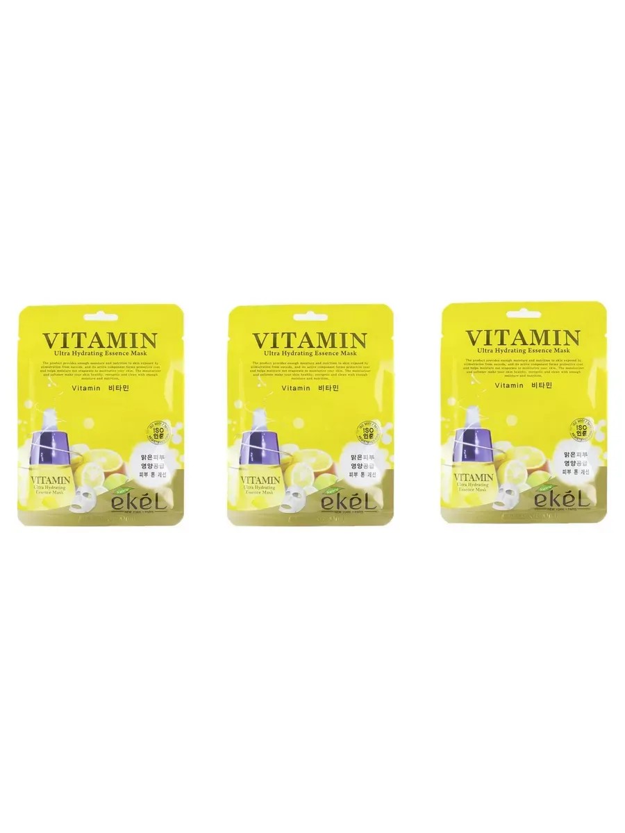 Ekel Vitamin, Маска тканевая Витаминная 3 штуки. Системный уход помогает поддерживать молодость покровов, их ровный цвет и упругую бархатистую поверхность. Расширенные поры сужаются, нормализуется выработка кожного секрета. Благодаря экстрактам спелых цитрусов оттенок лица становится светлее, витамины снабжают ткани энергией, помогают устранить следы усталости и негативного влияния внешней среды. Способ применения: перед применением маски обязательно очистить кожу. Маску еще в закрытом пакете стоит немного помять, чтобы эссенция равномерно распределилась по самой маске, и только потом открыть пакет. Маску можно нанести теплой (согрейте пакет с маской в горячей воде) или холодной (охладить в холодильнике). Аккуратно распределить маску на лице. Эссенцию, которая осталась в пакете, нанесите на шею и декольте. По истечении 20-30 минут маску снять, ничего смывать не нужно.