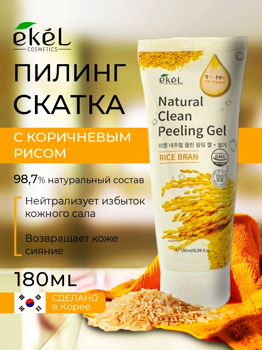 Пилинг-скатка с рисовыми отрубями Ekel Rice Bran Natural Clean Peeling Gel. Пилинг-гель для лица с экстрактом коричневого риса эффективно отшелушивает омертвевшие клетки кожи лица и шеи. Глубоко очищает поры. Крем стимулирует процесс клеточного обновления и возвращает коже естественное сияние. Благодаря мягкой механической эксфолиации (натуральная целлюлоза 100%), мгновенно удаляет загрязнения , омертвевшие клетки и окисленные протеины с поверхности кожи. Обладает великолепным очищающим действием, не повреждает поверхность кожи не разрушая ее естественный защитный слой. Рисовые отруби, состоящие из мелких частичек мягко отшлифовывают отмершие клетки кожи, делая кожу более ровной. Экстракт рисовых отрубей (гликолиды и фосфолипиды) используется для ухода за кожей как смягчающий и влагоудерживающий компонент. Этот пилинг-гель создан по принципу гоммажа - он совершенно не травмирует кожу, оставляя на ней царапины, как скрабы. Ваша кожа будет очищенной, но здоровой, никаких раздражений сухости и шелушений, как от скрабов и жестких пилингов. Подходит для любого типа кожи. Пилинг-гель для лица с экстрактом коричневого риса содержит экстракты: алоэ , ромашки, морских водорослей. Глубоко очищает поры. Рисовые отруби, состоящие из мелких частичек, мягко отшлифовывают отмершие клетки кожи, делая кожу более ровной. Скраб для лица екель улучшает состояние кожи после первой процедуры! Очищает от черных точек, при постоянном использовании снижает их появление. Пилинг воздействует на кожу, избавляет от загрязнений и отмершего слоя клеток. Рекомендуется к использованию в уходе против акне и от прыщей. Возможно использование на сухой, чувствительной коже. В отличие от энзимной пудры пилинг-скатка проста в использовании. Пилинг скатка возвращает сияние и здоровый вид, выравнивает тон и текстуру кожи. Незначительно осветляет пигментацию. Поэтому выбирайте только качественные косметические средства, лучше если это будет профессиональный уход.