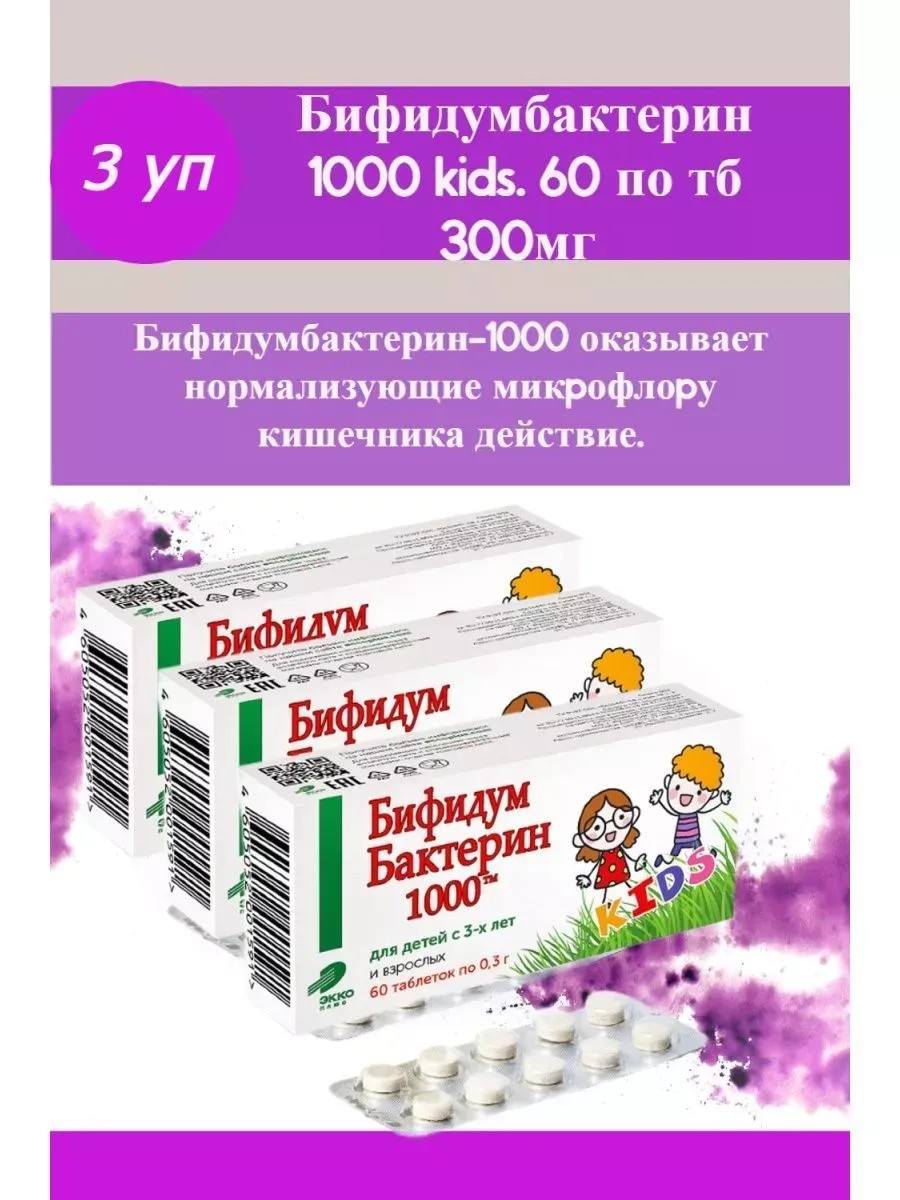 Бифидумбактерин 1000 - это высококачественный пробиотик, который содержит бактерии полезные и необходимые для поддержания здоровой микрофлоры кишечника. Препарат выпускается в виде таблеток массой 0,3 грамма, 60 штук. Он помогает восстанавливать баланс микрофлоры при дисбактериозе, нарушении кишечной функции, а также после приема антибиотиков. Бифидумбактерин 1000 эффективен и безопасен в использовании для взрослых и детей.Бифидумбактерин 1000 - дневной прием препарата содержит 600 миллионов КОЕ бифидобактерий (120% от адекватного уровня потребления в сутки). Это в 10 раз больше, чем аналоги - обычно они содержат лишь 50 миллионов единиц.БифидумБактерин-1000 содержит бифидобактерии, обладающие антагонистической активностью против широкого спектра патогенов.Прием бифидобактерий нормализует микрофлору желудочно-кишечного тракта, усиливает активное действие применяемых препаратов, нейтрализует побочное действие антибиотиков, устраняет клинические проявления дисбиоза, необходим в период реабилитации.Кроме того, бифидобактерии достаточно активно продуцируют витамины группы В, синтезируют витамин К, способствуют усвоению витамина D.Бактерии, входящие в состав БифидумБактерин-1000, устойчивы к низкой рН желудочного сока, сохраняют жизнеспособность при прохождении через ЖКТ, быстро размножаются и заселяют кишечник. При этом имеют естественное происхождение и безопасны для человека.Отличительные особенности БифидумБактерин-1000:-содержит 600 000 000 бифидобактерий-выпускается в таблетках и максимально удобен в применении-разрешен взрослым и детям с 3-х лет-не требует хранения в холоде - бифидобактерии остаются стабильными при комнатной температуре.РЕКОМЕНДАЦИИ ПО ПРИМЕНЕНИЮ:Взрослым по 2 таблетки 3 раза в день во время еды, продолжительность приема - 1-3 месяца.Детям старше 3-х лет по 1-2 таблетки 3 раза в день во время еды, продолжительность приема - 1 месяц.