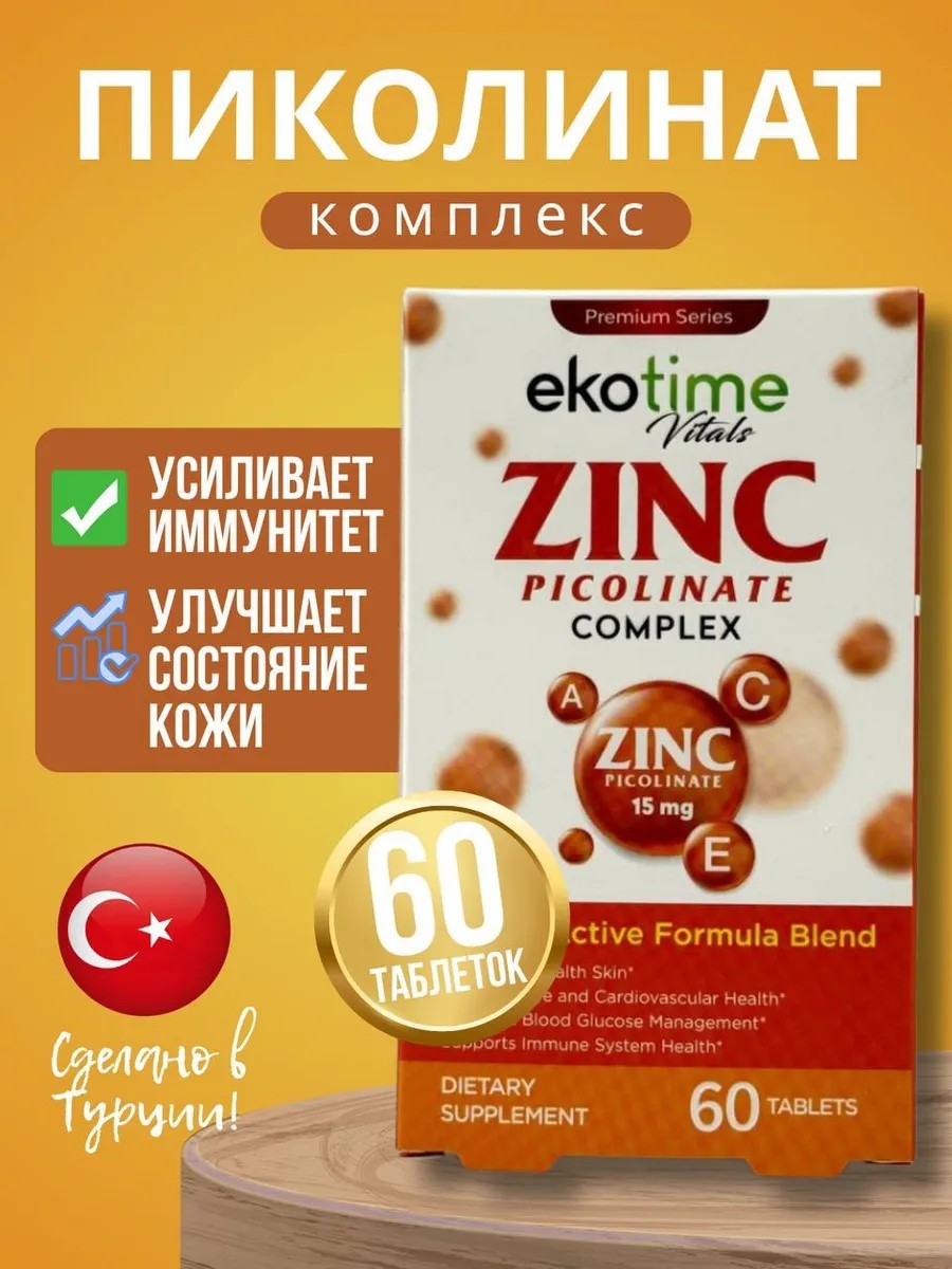 | Package contents | cardboard box; blisters; 30 tablets with Zinc Picolinate Complex Ekotime Vitals ZINC PICOLINATE COMPLEX |