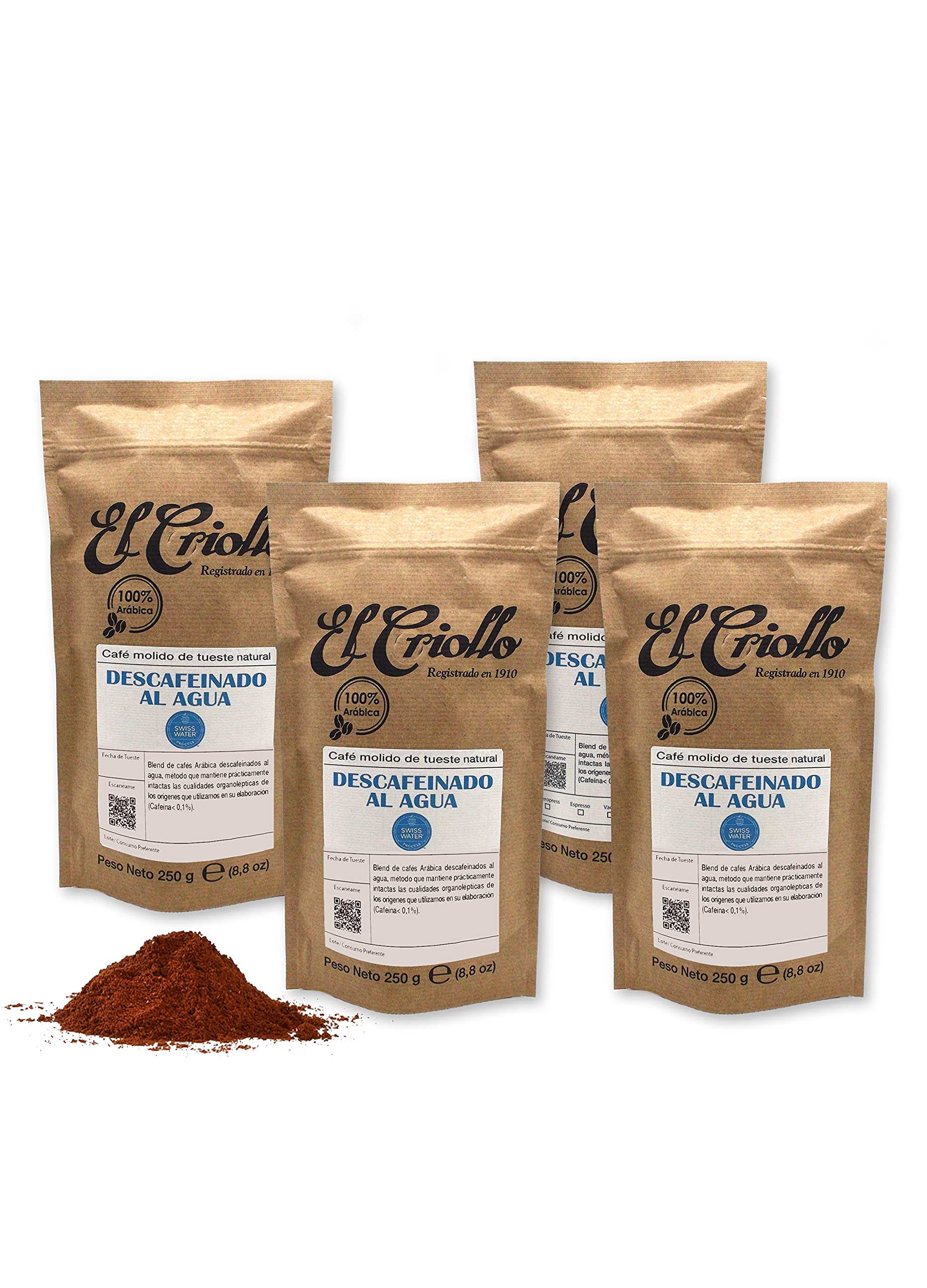 El Criollo MOULU Decaffeinated Water Coffee - El Criollo Coffees | Gourmet Coffee 100% Arabica and Natural Roast | Pack of 4x250 gr (1 kg)