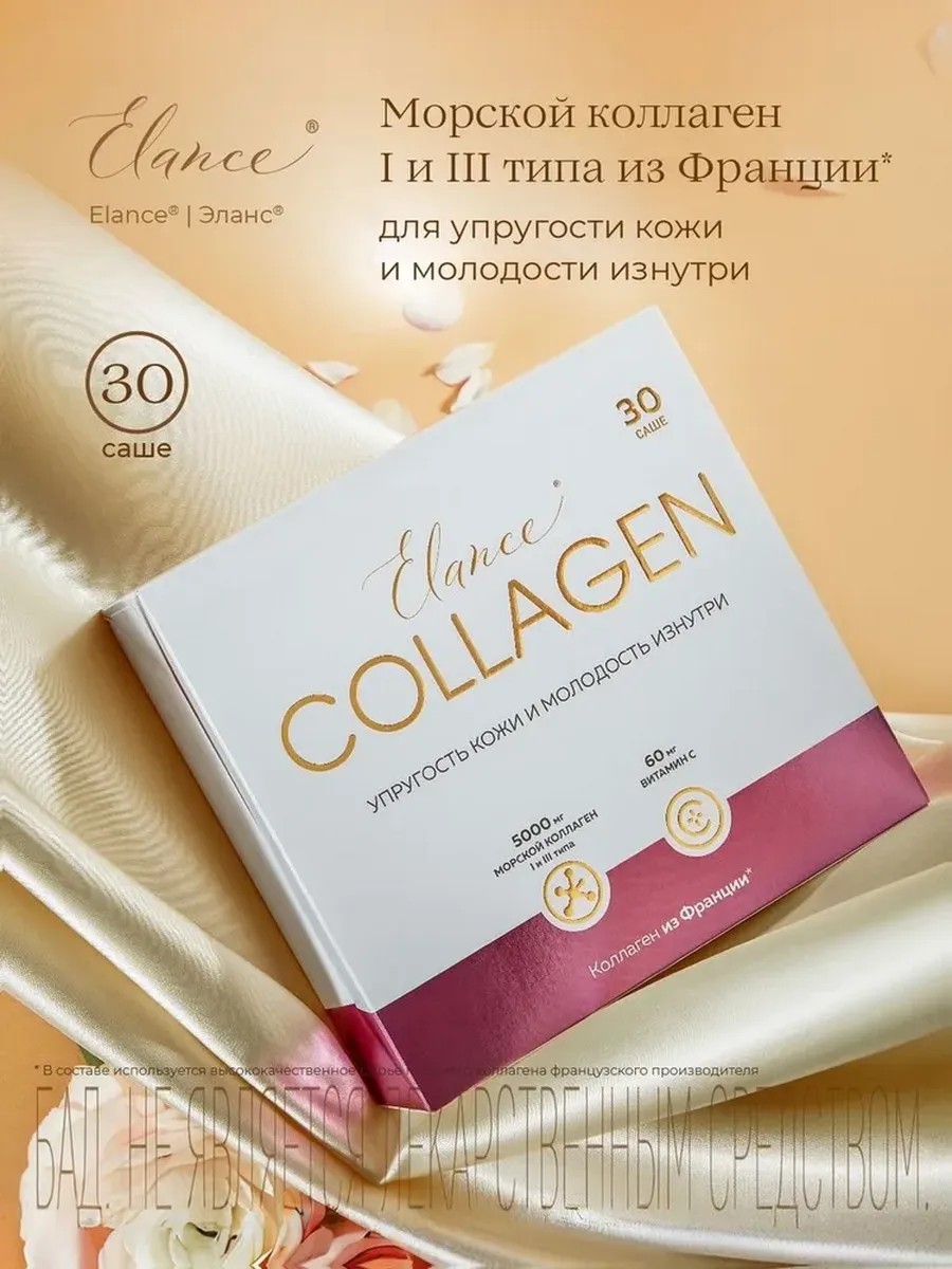 Эланс Collagen - это премиальный продукт высшего качества, в составе гидролизованный коллаген 1 и 3 типа из Франции (в составе сырьё известного французского производителя) и витамин C, который стимулирует выработку коллагена в организме. Коллаген - это основной белок соединительной ткани организма. Ежедневное употребление способствует эластичности и упругости кожи, уменьшает и разглаживает морщинки, замедляет процессы старения. Морской коллаген необходим для поддержания эластичности кожи, и лучше усваивается организмом. Коллаген морской с витамином С позволяет увеличить плотность коллагенового слоя и улучшить структуру кожи - она становится более увлажнённой и гладкой. Коллаген порошок в комплексе с витамином С обеспечивает рост и красоту волос. Коллаген входит в комплекс витаминов для женщин, помогает против морщин, от старения кожи.
