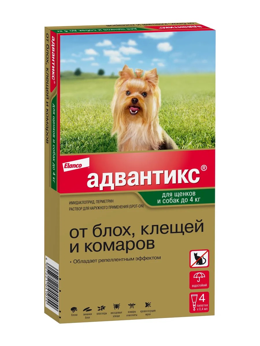 Elanco Адвантикс для щенков и собак до 4кг 0,4мл,упаковка 4пипетки