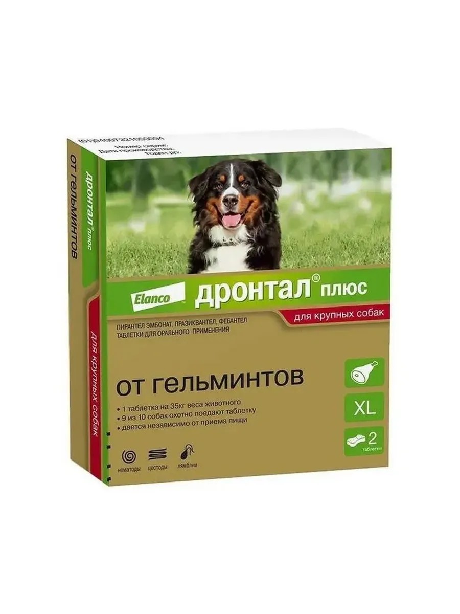 Дронтал плюс XL выпускается в виде косточки со вкусом мяса с удобной дозировкой - 1 таблетка на 35 кг массы животного. Разрешен всем породам собак. Дронтал - антигельминтик широкого спектра, действующий на: различные виды круглых (токсокары, токсоскары, анкилостомы, власоглавы и др.) гельминтов; различные виды ленточных (дипилидии, тении, эхинококки и др.) гельминтов; простейших рода лямблий.
