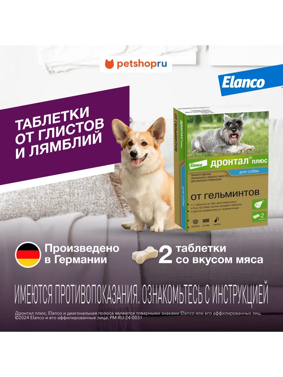 Elanco Дронтал Плюс для собак со вкусом мяса, 10кг, 2 таб