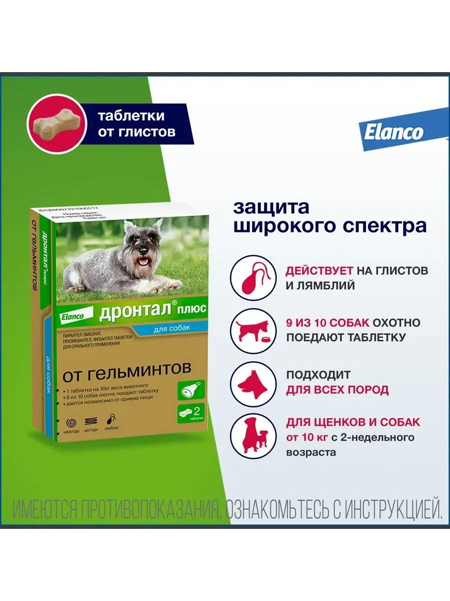 Дронтал плюс, таблетки от глистов и простейших для собак, – препарат от компании Elanco, помогающий избавить вашего питомца от самых распространенных внутренних паразитов – круглых и ленточных гельминтов, а также от простейших – лямблий. Дронтал плюс выпускается в виде косточки со вкусом мяса с удобной дозировкой – 1 таблетка на 10 кг массы животного, подходит для собак с 2 кг веса. Разрешен всем породам собак. широкий спектр действия – круглые и ленточные гельминты, простейшие (лямблии), таблетка в форме косточки со вкусом мяса – хорошо поедается собаками*, разрешен для всех пород собак, для щенков и собак с 2 кг веса, для щенков с 2-недельного возраста, разрешен в последнюю треть беременности и во время лактации, в упаковку вложены наклейки для паспорта животного, Фармакологическое действие: Фебантел, входящий в состав препарата, повышает проницаемость клеточных мембран, что приводит к нарушению мышечной иннервации, параличу и гибели круглых гельминтов и способствует их выведению из желудочно-кишечного тракта. Пирантела эмбонат вызывает повышение проницаемости клеточных мембран, необратимый паралич и контрактуру мышц у круглых гельминтов, что приводит к гибели паразитов и их выведению из желудочно-кишечного тракта. Пирантела эмбонат и фебантел частично всасываются в кишечнике и выводятся из организма в основном с фекалиями в течение 24–48 часов. Празиквантел вызывает деполяризацию нейромышечных ганглиоблокаторов, нарушает транспорт глюкозы и микротурбулярную функцию у ленточных гельминтов, что приводит к нарушению мышечной иннервации, параличу и гибели паразитов. Празиквантел быстро всасывается в кишечнике и распределяется во внутренних органах и тканях; выводится из организма с мочой в основном в метаболизированной форме. Противопоказания: Противопоказанием к применению является индивидуальная повышенная чувствительность животного к компонентам препарата (в том числе в анамнезе). Не следует применять препарат животным массой менее 2 кг, щенным сукам первые две трети периода беременности и щенкам моложе 2-недельного возраста. Побочные действия: При применении препарата в соответствии с инструкцией побочных явлений и осложнений, как правило, не наблюдается. При повышенной индивидуальной чувствительности животного к компонентам препарата, возможны повышенная саливация, диарея или рвота. Указанные симптомы кратковременны, самопроизвольно исчезают и не требуют применения лекарственных средств. Специальные указания: Дронтал плюс не следует применять одновременно с препаратами, содержащими пиперазин ввиду возможных антагонистических эффектов. Условия хранения: Препарат хранят в закрытой упаковке производителя отдельно от продуктов питания и кормов при температуре от 2°C до 25°C в местах, недоступных для детей. Способ применения и дозы: Дронтал плюс применяют собакам индивидуально однократно из расчета 1 таблетка в форме косточки на 10 кг массы животного. Дозы препарата указаны в таблице: Macca собаки/Дозировка препарата Дронтал плюс 1 таблетка на 10 кг: Щенки и собаки маленьких пород 2–5 кг – ½ таблетки 5–10 кг – 1 таблетка Собаки средних пород 10–20 кг – 2 таблетки 20–30 кг – 3 таблетки Собаки крупных пород 30–40 кг – 4 таблетки 40–50 кг – 5 таблеток Для собак массой более 50 кг применяется дозировка из расчета 1 таблетка н