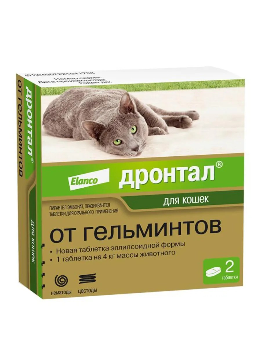 Дронтал выпускается в виде небольшой овальной таблетки с удобной дозировкой – 1 таблетка на 4 кг массы животного, подходит для кошек с 1 кг веса. Разрешен всем породам кошек. Производится в Германии.