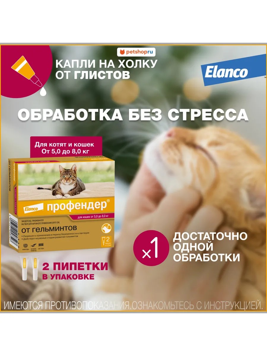 Профендер, капли на холку от гельминтов для кошек - новый взгляд на обработку кошек от глистов: помогает комфортно и без лишнего стресса избавлять вашего питомца от внутренних паразитов путем нанесения препарата на кожу в области основания шеи. Профендер имеет удобную дозировку по весу животного, его можно использовать котятам с 8-недельного возраста, беременным и кормящим кошкам. Препарат от компании Elanco, производится в Германии.
