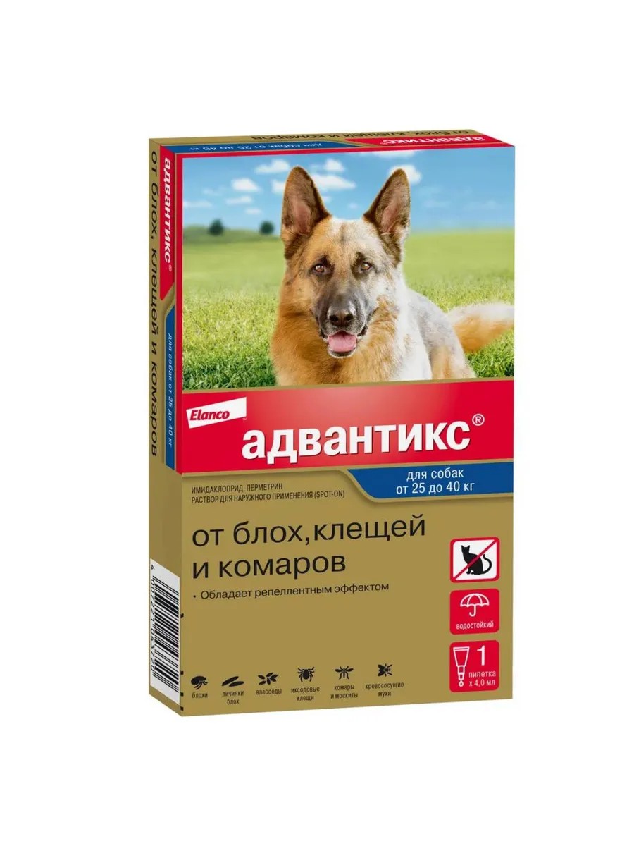 Капли для собак 25-40кг от блох и клещей для уничтожения широкого спектра насекомых, паразитирующих на собаках, в частности блох, иксодовых клещей, а также летающих насекомых.