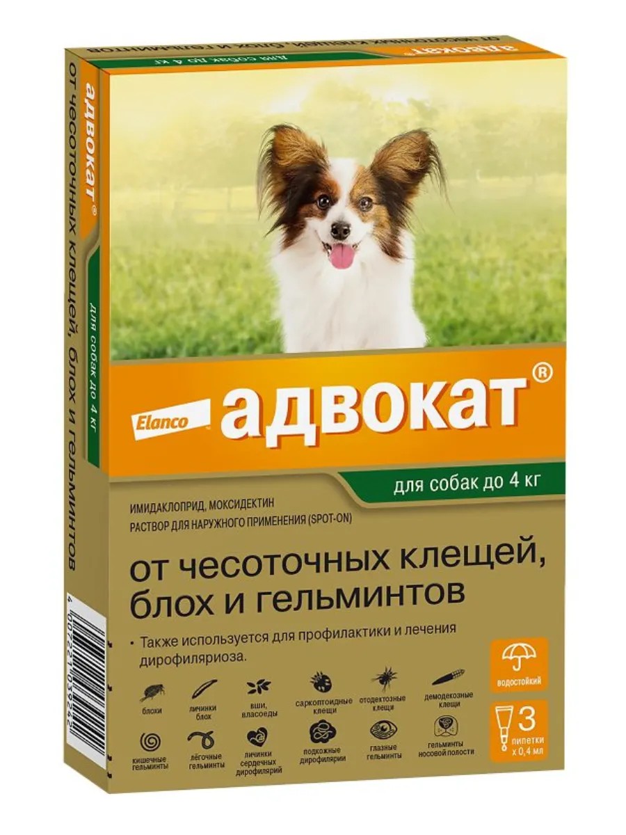 Назначают собакам миниатюрных пород весом до4кг для лечения и профилактики нематодозов, энтомозов, саркоптоидозов (в т.ч. саркоптоза и отодектоза) и демодекоза. Адвокат - комплексный препарат широкого спектра, действующий на наружных паразитов – блох, вшей, власоедов и чесоточных клещей, которые могут вызывать зуд у собаки и приводить к таким заболеваниям, как блошиный аллергический дерматит, отодектоз, саркоптоз, демодекоз; внутренних паразитов – круглых гельминтов, паразитирующих в кишечнике, глазах и носовой полости, а также на личинок особо опасных глистов (дирофилярий), взрослые особи которых могут жить в сердце собаки, а также на дирофилярий под кожей. В составе препарата имидаклоприд и моксидектин. Имидаклоприд действует на блох, вшей и власоедов, нарушая передачу нервных импульсов и приводя к гибели паразитов. Имидаклоприд относится к инсектицидам, механизм действия которых основан на взаимодействии с рецепторами членистоногих и нарушении передачи нервных импульсов, что приводит к гибели насекомых.