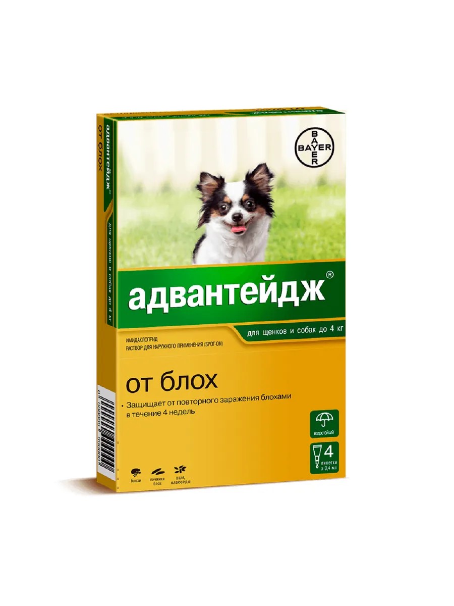 | Полное наименование товара | Капли на холку Адвантейдж от блох для щенков и взрослых собак, 4 пипетки, до 4 кг |