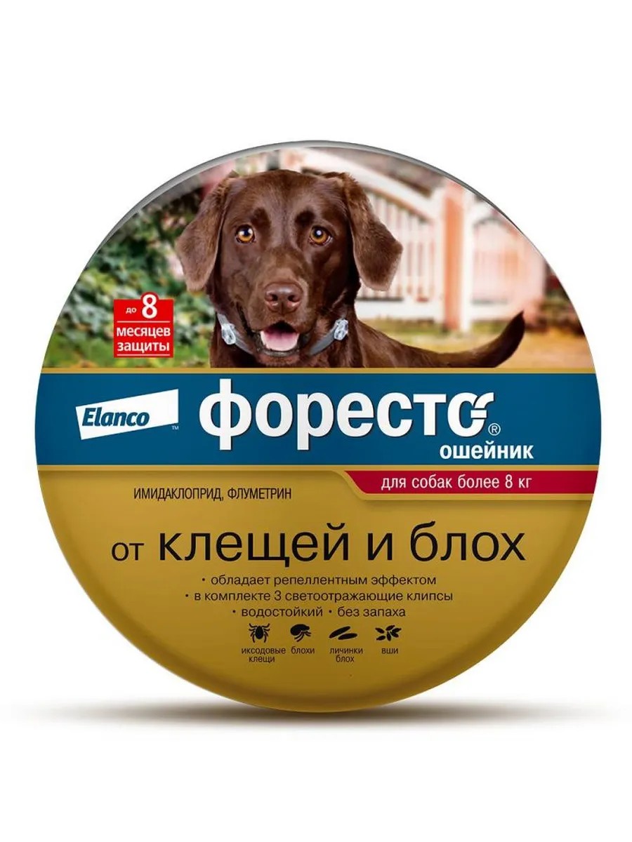 Ошейник от блох и клещей Форесто - препарат от компании Elanco, который помогает защитить собаку от укусов клещей и блох до 8 месяцев. Просто наденьте ошейник на собаку.