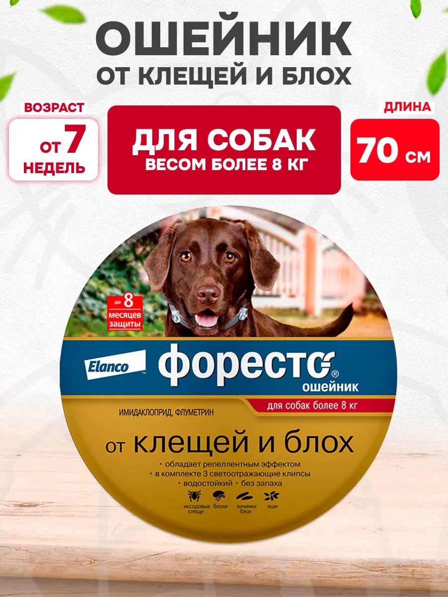 Ошейник Форесто предназначен для защиты от нападения клещей в течение 7-8 месяцев. Эффективен против блох, вшей, власоедов в течение 6 месяцев.