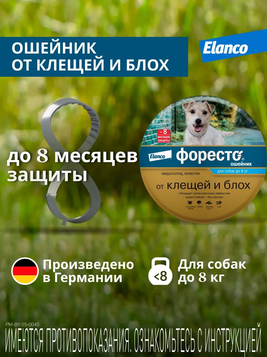 Ошейник от блох и клещей Форесто - препарат от компании Elanco, который помогает защитить собаку от укусов клещей и блох до 8 месяцев. Просто наденьте ошейник на собаку.