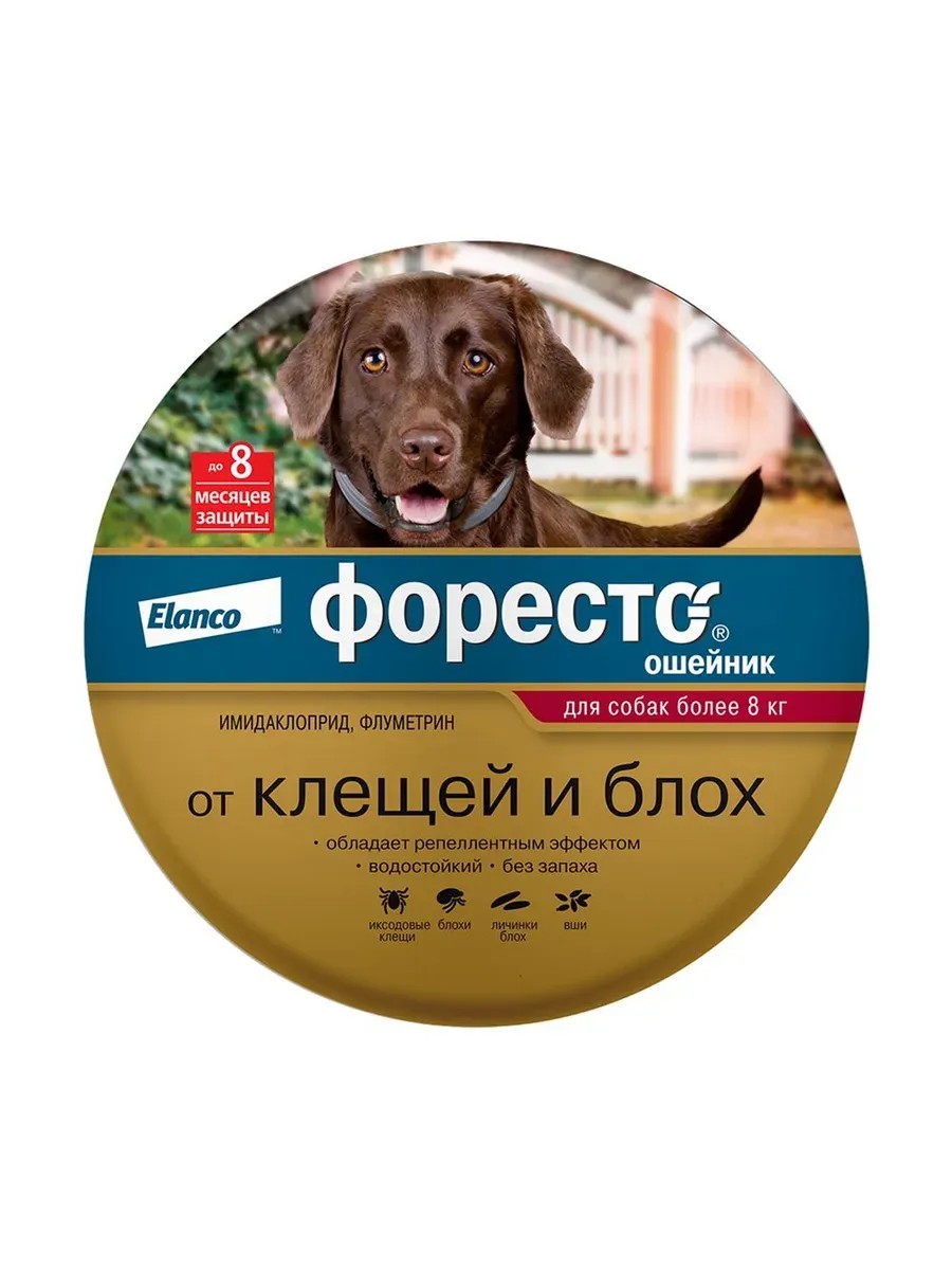 Ошейник от блох и клещей Форесто - препарат от компании Elanco, который помогает защитить собаку от укусов клещей и блох* до 8 месяцев. Просто наденьте ошейник на собаку.Большинство клещей покидают животное, не успев укусить его – это называется репеллентный эффект. Как раз таким эффектом обладает Форесто, снижая риск передачи опасных заболеваний, переносимых паразитами.Материалы, из которых изготовлен ошейник, постоянно выделяют действующие вещества в небольших дозах, необходимых для защиты питомца. Действующие вещества распространяются по всей площади тела животного, помогая защитить его от наружных паразитов до 8 месяцев.Собаку в ошейнике можно гладить и наслаждаться игрой дома и на улице. Только не забывайте про меры личной гигиены, такие как мытье рук после общения с питомцем.Собака может плавать в ошейнике, т.к. его компоненты не вымываются из ленты водой. При мытье животного ошейник Форесто снимать не нужно.Форесто не имеет запаха и подходит охотничьим собакам, не нарушая их обоняние.Носить ошейник рекомендовано постоянно. Характеристики: Обеспечивает защиту до 8 месяцев. Сам дозирует и распределяет защиту по шерсти и коже питомца. Действует на клещей до укуса. Водостойкий. Не пахнет и обладает высоким профилем безопасности для животных и человека. Действующее вещество: Имидаклоприд, флуметрин Состав: Комбинация имидаклоприда и флуметрина позволяет действующим веществам усиливать действие друг друга на клещей, блох и других наружных паразитов: имидаклоприд действует на взрослых блох, их личинок, находящихся на собаке и в окружающей среде, а также на вшей и власоедов; флуметрин действует на иксодовых клещей на разных стадиях их развития. Фармакологическое действие:Имидаклоприд, входящий в состав препарата, относится к группе хлороникотиниловых инсектицидов, механизм действия которых основан на взаимодействии с ацетилхолиновыми рецепторами членистоногих и нарушении передачи нервных импульсов, вызывающих гибель насекомых.Флуметрин относится к классу пиретроидных акарицидов. Механизм действия заключается в необратимой активации натриевых каналов мембран нервных клеток, что приводит к нарушению двигательных рефлексов, параличу и гибели членистоногих. Противопоказания: Индивидуальная чувствительность к компонентам препарата. Ошейник не следует применять больным инфекционными заболеваниями и выздоравливающим животным, а также щенкам моложе 7-недельного возраста. Побочные действия: Побочных явлений и осложнений при применении препарата Форесто в соответствии с инструкцией, как правило, не наблюдается. В редких случаях на месте контакта препарата с кожей возможны индивидуальные реакции (покраснение кожи, зуд, выпадение шерсти), которые самопроизвольно проходят и не требуют применения лекарственных средств. Условия хранения: Препарат следует хранить в закрытой упаковке, отдельно от продуктов питания и кормов, при температуре от 2˚С до 30˚С. Препарат следует хранить в местах, недоступных для детей. Форма выпуска:Полимерная лентаСрок годности:5 лет с даты производства Производство:Германия - Heinz Mehlhorn, Norbert Mencke, Olaf Hansen. Effects of imidacloprid on adult and larval stages of the flea Ctenocephalides felis after in vivo and in vitro application: a light- and electron-microscopy study. Parasitol Res (1999) 85: 625 ± 637Форесто, Elanco и диагональная полоса Elanco являются торговыми знаками Elanco или его аффи